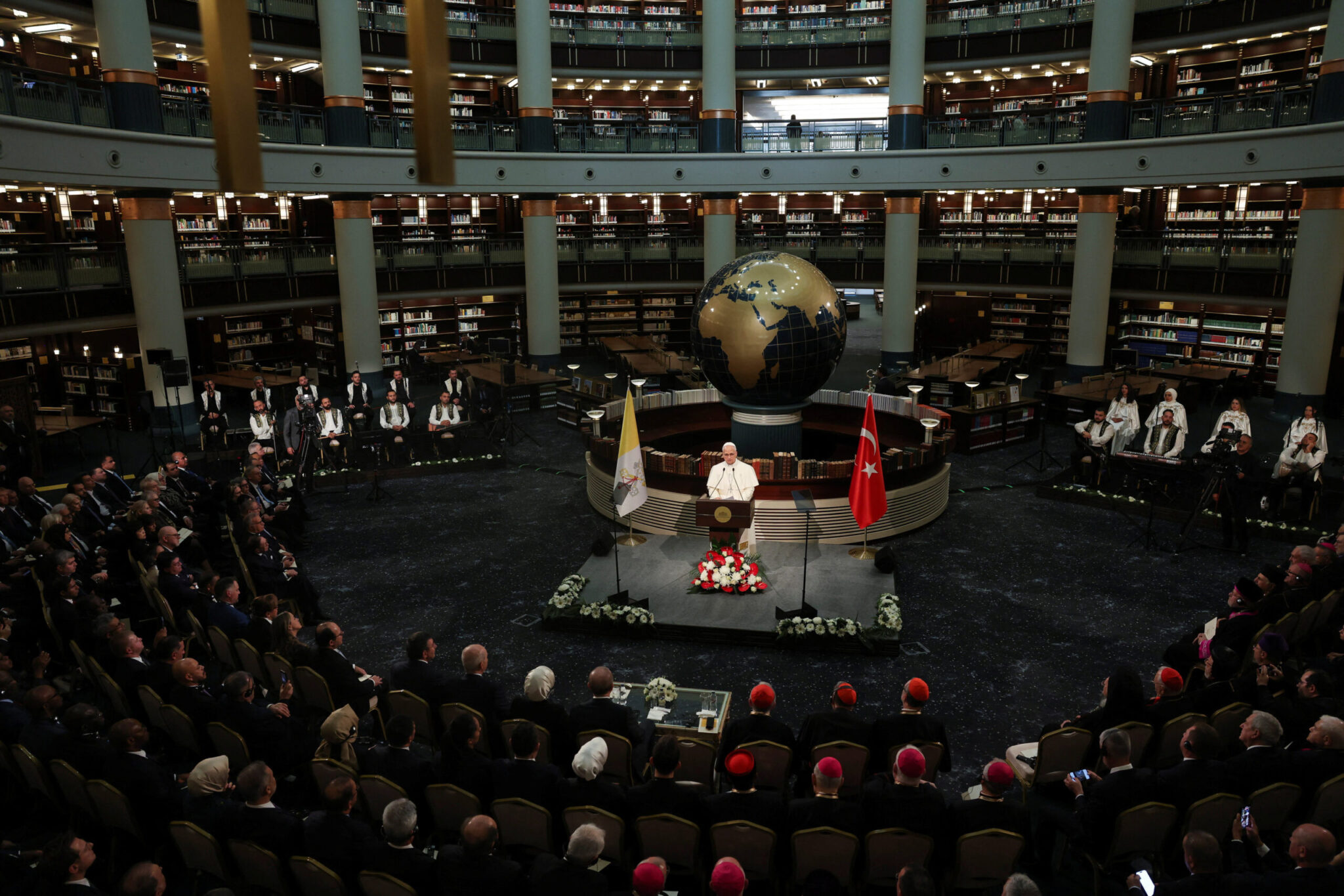 Ο επικεφαλής του κράτους του Βατικανού, Πάπας Λέων ΙΔ’, απηύθυνε χαιρετισμό στους καλεσμένους στην Εθνική Βιβλιοθήκη Beştepe μετά τη διμερή συνάντησή του με τον Πρόεδρο Ρετζέπ Ταγίπ Ερντογάν.