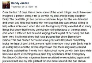 Αλλά όταν επηρέασε και την αγαπημένη της συνήθεια, το τραγούδι, τότε πήρε ένα μέρος της ψυχής της. Έπασχε σοβαρά από ημικρανίες που την ταλαιπωρούσαν ήδη από το δημοτικό. Αυτό την έκανε να χάσει δύο χρόνια στο UBC (σ.σ. Πανεπιστήμιο της Βρετανικής Κολομβίας), κάτι που έκανε πραγματικά την καρδιά της να σπάσει. Δεν νομίζω πως κανείς ήξερε πραγματικά πόσο πόνο υφίστατο καθημερινά η Έμιλι και την σοβαρή κατάθλιψη που της προκαλούσαν οι ημικρανίες της. Η Έμιλι έβλεπε τους φίλους της από το σχολείο να προχωρούν με τη ζωή τους, τη στιγμή που η δική της ζωή ξοδευόταν σε κουβάδες για εμετό και ώρες ολόκληρες στα επείγοντα.
