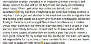 Στη δημοσίευση του, που έγινε κατά τις μεσημεριανές ώρες, ο άνδρας αναφέρει πως σκότωσε πρώτη την κόρη του, λόγω των πολύχρονων ημικρανιών που την ταλαιπωρούσαν, ώστε να την «ανακουφίσει», από αυτές, καθώς «δεν μπορούσε να τις ξεπεράσει».