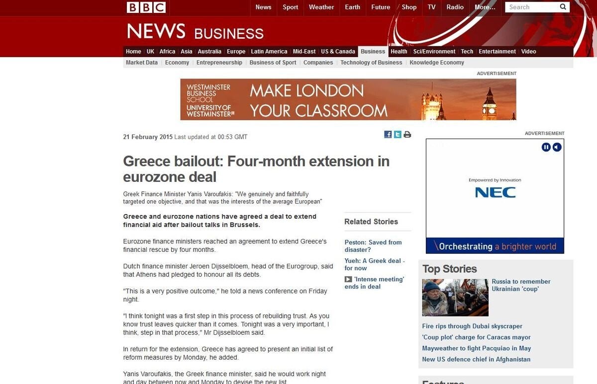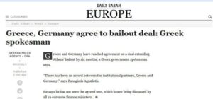 «Οι υπουργοί Οικονομικών της ευρωζώνης πέτυχαν μια συμφωνία για να αποτρέψουν το κλείσιμο του προγράμματος χρηματοδότησης της Ελλάδας, ύστερα από έναν αγωνιώδη διπλωματικό γύρο στις Βρυξέλλες. Το πρόγραμμα βοήθειας της Ελλάδας θα παραταθεί για τέσσερις μήνες, με την νέα κυβέρνηση της Αριστεράς να δεσμεύεται ότι δεν θα αποσύρει τα μέτρα λιτότητας που συνδέονται με τη διάσωση», αναφέρει η βρετανική εφημερίδα στην ιστοσελίδα της.