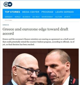 “Μετά από έντονες διαπραγματεύσεις επιτεύχθηκε συμφωνία για την επέκταση κατά τέσσερις μήνες της οικονομικής βοήθειας προς την Ελλάδα – Η Αθήνα θα παρουσιάσει ένα κατάλογο μεταρρυθμίσεων μέχρι τη Δευτέρα” γράφει η Figaro.
