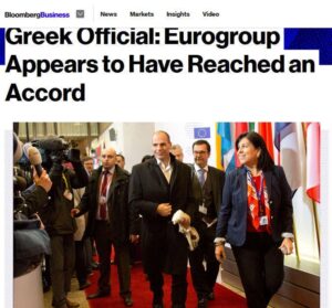 «Οι υπουργοί Οικονομικών της ευρωζώνης κατέληξαν σε συμφωνία που θα συνεχίσει τη ροή κεφαλαίων προς την Ελλάδα, στο πλαίσιο της δανειακής σύμβασης», αναφέρεται σε δημοσίευμα του ειδησεογραφικού πρακτορείου Bloomberg, προσθέτοντας «με αντάλλαγμα τη δέσμευση της Ελλάδας να πληροί ορισμένες προϋποθέσεις, αγοράζοντας χρόνο για να επεξεργαστεί τις λεπτομέρειες της χορήγησης των μακροπρόθεσμων χρηματοδοτήσεων».