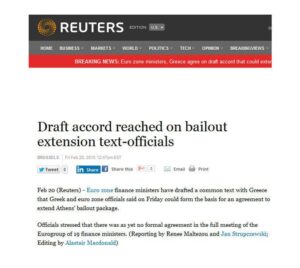 Επιπλέον, η συμφωνία υποχρέωσε το νεο ριζοσπάστη πρωθυπουργό Αλέξη Τσίπρα σε μια πολιτική υπαναχώρηση από τις υποσχέσεις για αποχώρηση από το σύμφωνο οικονομικής διάσωσης, τερματισμό της συνεργασίας με την περιβόητη “τρόικα” και αντιστροφή της λιτότητας», εκτιμά το Reuters.