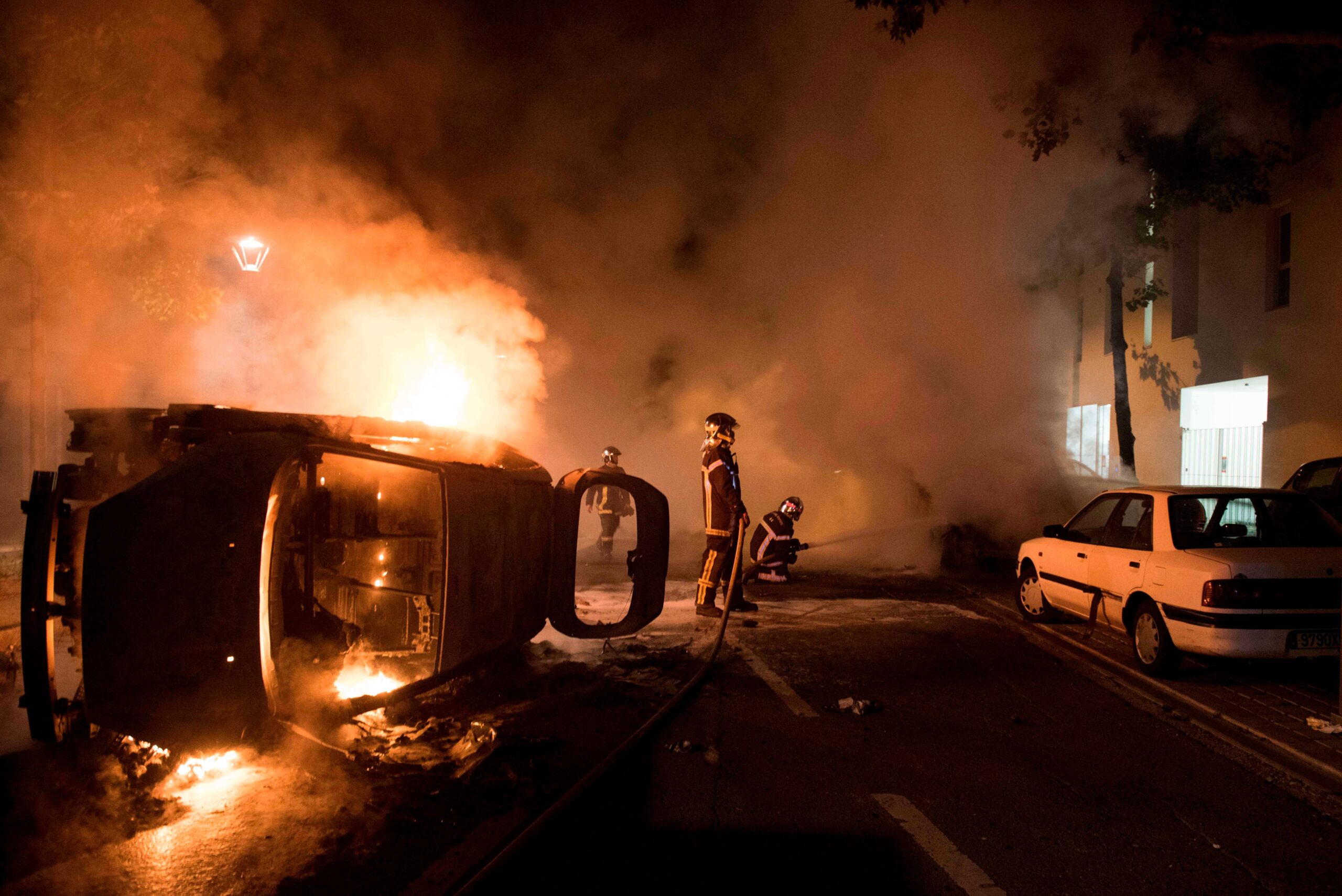 Σήμερα το πρωί, οι πυροσβέστες προσπαθούσαν ακόμη να σβήσουν τις φωτιές που άναψαν οι νεαροί κατά τη διάρκεια της νύχτας στο προάστιο Ντερβαγιέρ. «Είναι άσχημο, δεν το καταλαβαίνω» ξέσπασε μια γυναίκα, ιδιοκτήτρια ενός μαροκινού εστιατορίου πρόχειρου φαγητού, σοκαρισμένη που είχε το κατάστημά της και το αυτοκίνητό της να έχουν μετατραπεί σε αποκαΐδια.