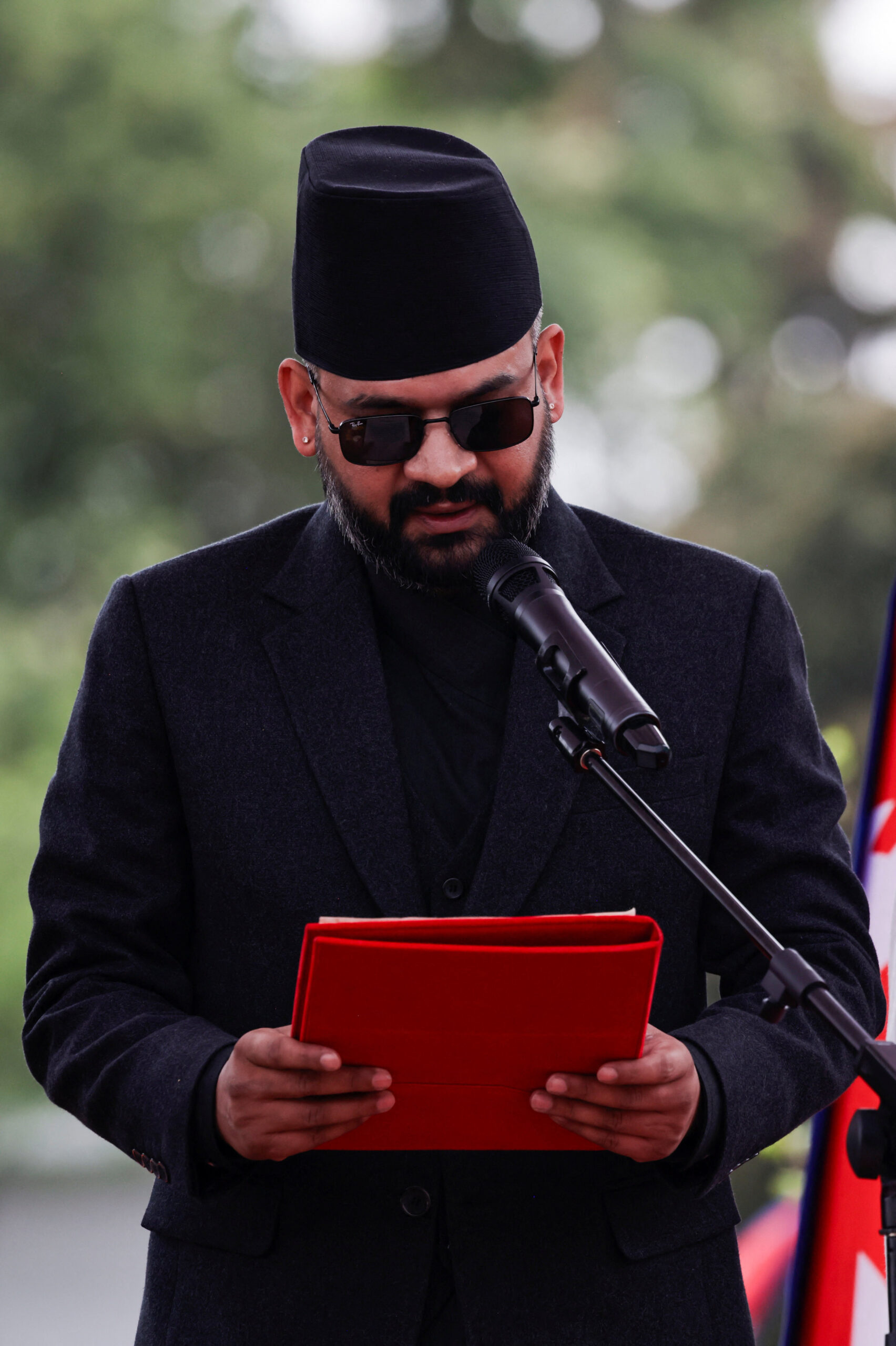 Ο Σαχ, ο οποίος φορούσε στενό μαύρο παντελόνι με ασορτί σακάκι, το χαρακτηριστικό νεπαλέζικο υφασμάτινο καπέλο και γυαλιά ηλίου, ορκίστηκε στο Προεδρικό Μέγαρο παρουσία διπλωματών και ανώτερων κυβερνητικών αξιωματούχων.