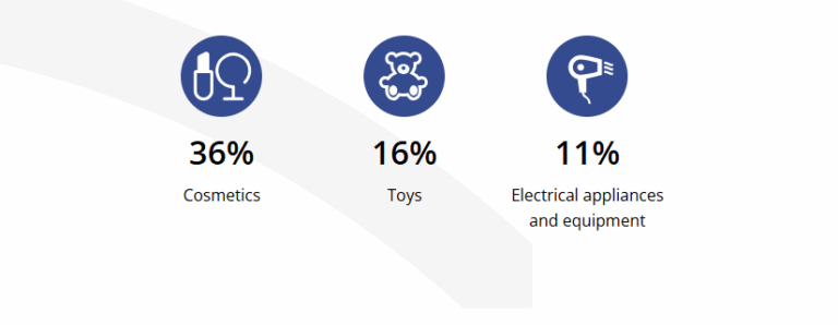 Σύμφωνα με την έκθεση, καλλυντικά, παιχνίδια και ηλεκτρικές συσκευές και εξοπλισμός αποτελούν τις κατηγορίες προϊόντων με τις περισσότερες ειδοποιήσεις. Τα καλλυντικά αντιστοιχούν στο 36% των περιπτώσεων, τα παιχνίδια στο 16%, ενώ οι ηλεκτρικές συσκευές και εξοπλισμός στο 11%.
