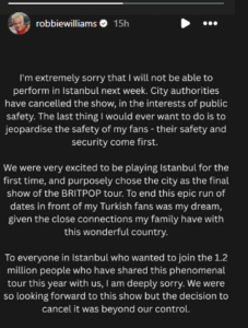 Ο Ρόμπι Γουίλαμς δήλωσε ότι «λυπάται βαθιά» για την ακύρωση της συναυλίας του στην Τουρκία «για λόγους δημόσιας ασφάλειας».