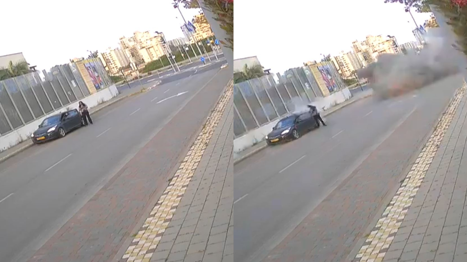 Η γυναίκα καταρρέει στο έδαφος δίπλα στο αυτοκίνητο, ενώ πυκνός μαύρος καπνός καλύπτει το σημείο, προκαλώντας σκηνές πανικού και χάους στην περιοχή.
