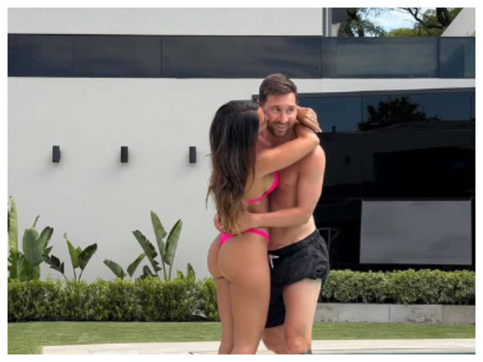 Η Αντονέλα δημοσίευσε μία φωτογραφία στο Instagram, δίπλα από την πισίνα του πολυτελούς σπιτιού της οικογένειας στο Μαϊάμι, ποζάροντας δίπλα στον αγαπημένο της σύζυγο, Λιονέλ Μέσι.