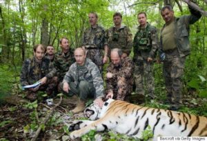 AMUR REGION, RUSSIA - UNDATED: Russian Prime Minister, Vladimir Putin tagging a Siberian Tiger whilst visiting the Barabash tiger reserve, in eastern Siberia in the Amur Region of the Russian Federation. Wildlife experts have warned that wild tigers could be extinct by 2022 if new measures to protect their habitat are not taken. Speaking at the Tiger Summit in St Petersburg, scientists from the World Wildlife Fund confirmed numbers of wild tigers have dwindled to 3,200 from 10,000 a century ago. These moving pictures show Russian Prime Minister, Vladimir Putin visiting the Barabash tiger reserve, in eastern Siberia. During his visit Mr Putin assisted staff in placing an electronic tag on a rare Amur (Siberian) tiger by shooting it with a tranquilliser gun. Amur tigers are extremely rare and almost became extinct in the wild in the 1940's. Tiger body parts are used in traditional Chinese medicine and one animal can fetch up to £20,000 on the black market. The object of the Tiger Summit is to double the number of tigers in the wild by 2022, the next time it will be the Chinese year of the Tiger. (Photo by Animal Press / Barcroft Media / Getty Images)