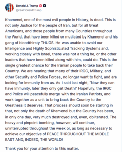 Ωστόσο, οι βαριές και ακριβείς βομβιστικές επιθέσεις θα συνεχιστούν αδιάκοπα καθ’ όλη τη διάρκεια της εβδομάδας ή για όσο διάστημα είναι απαραίτητο, προκειμένου να επιτύχουμε τον στόχο μας για ΕΙΡΗΝΗ ΣΕ ΟΛΗ ΤΗ ΜΕΣΗ ΑΝΑΤΟΛΗ ΚΑΙ, ΠΡΑΓΜΑΤΙΚΑ, ΣΕ ΟΛΟ ΤΟΝ ΚΟΣΜΟ!