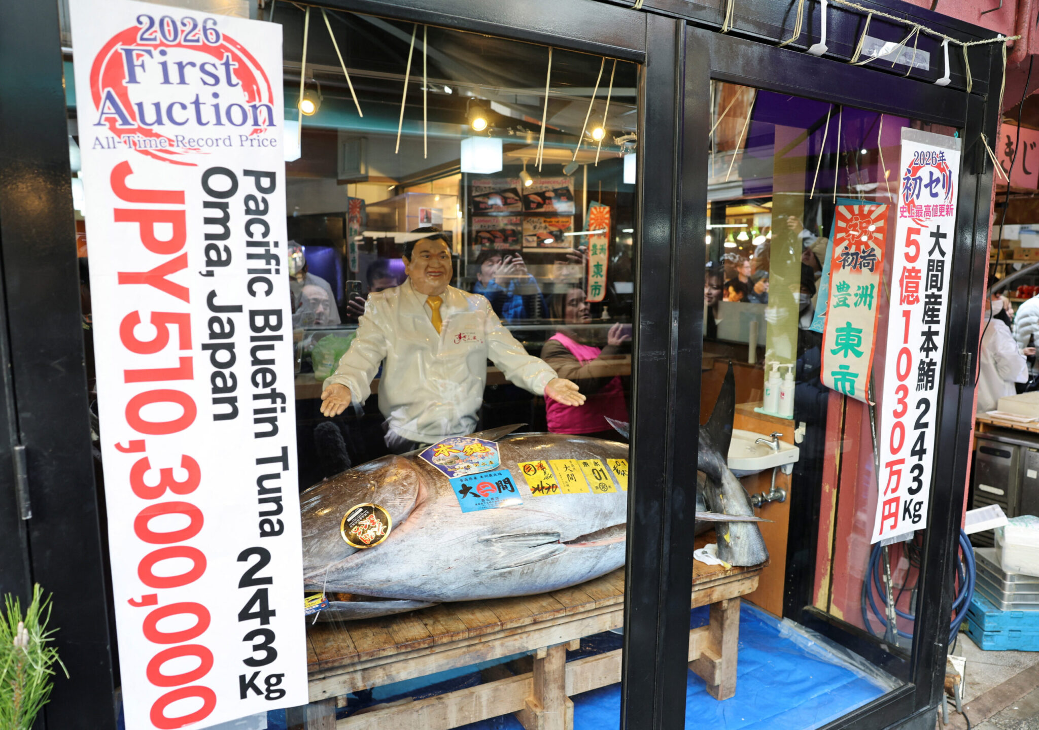 Ένας τεράστιος τόνος βάρους 243 κιλών πωλήθηκε με το ποσό ρεκόρ των 510 εκατομμυρίων γιεν (2,76 εκατομμύρια ευρώ) στην πρώτη δημοπρασία του 2026 στην ιχθυαγορά Τογιόσου του Τόκιο.