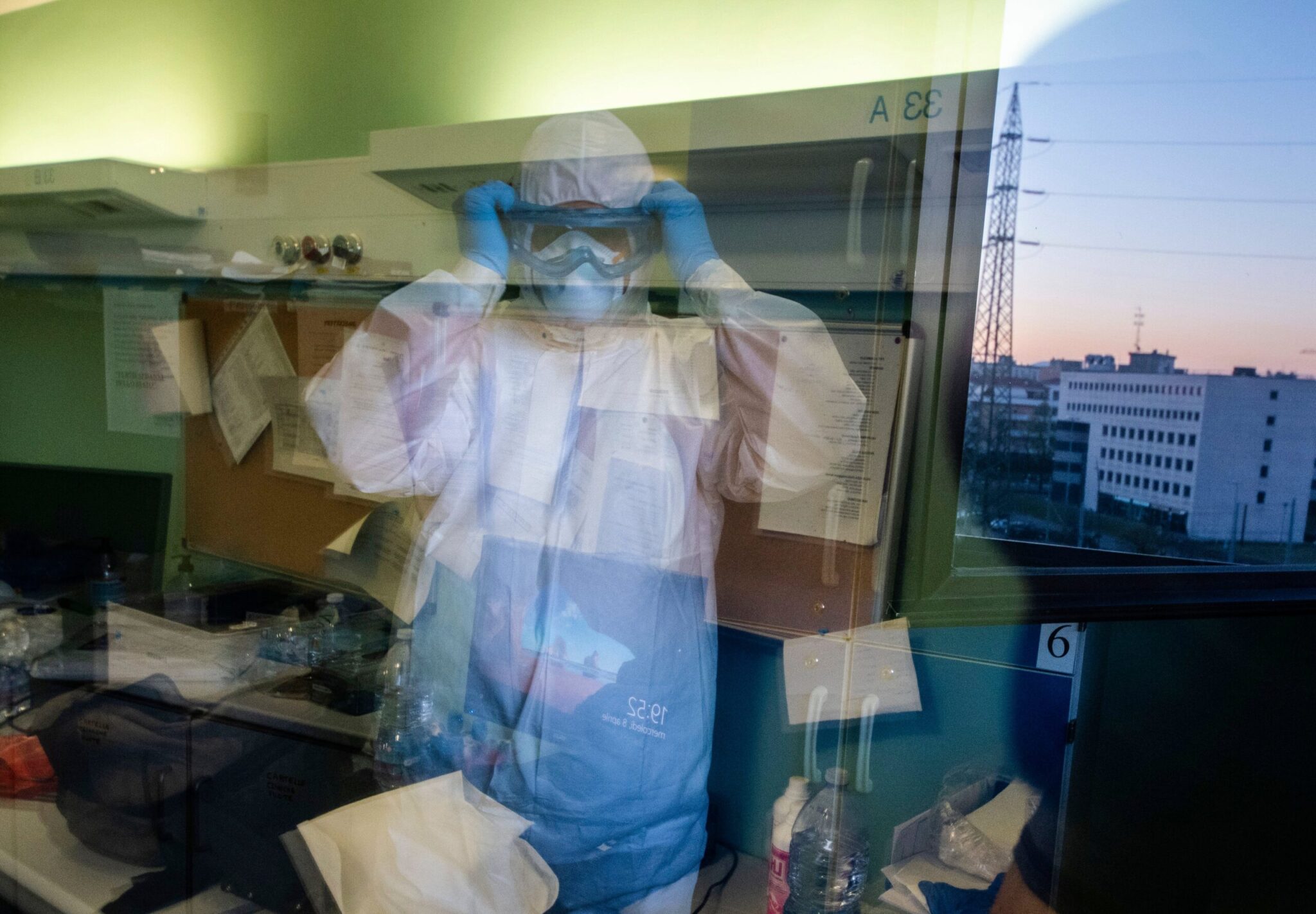 Ο γιατρός Τζιοβάνι Πασέρι χρησιμοποιεί μια τζαμαρία για καθρέφτη, για να δει εάν έχει φορέσει σωστά τη στολή του πριν ξεκινήσει τη βάρδια στον θάλαμο του COVID-19. Είναι γιατρός επί 32 χρόνια και λέει ότι αντιμετωπίζει έναν εχθρό που δεν έχει δει ποτέ ξανά, που ξέρει από εμπειρία ότι σκοτώνει πολλούς και πολύ γρήγορα (AP Photo/Domenico Stinellis)ASSOCIATED PRESS