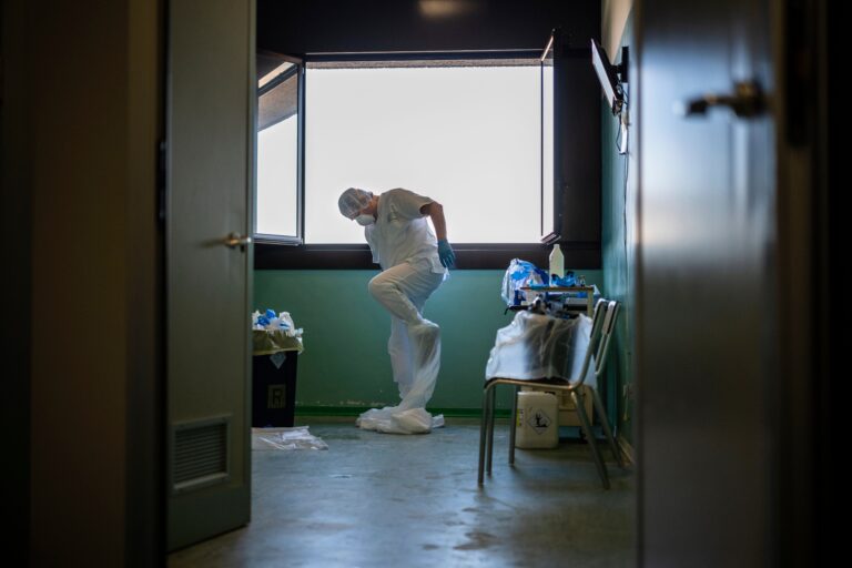 Μάσκα, γυαλιά, πολλά ζευγάρια γαντιών, τρείς προστατευτικές στολές, καλύμματα ποδιών: Στο τέλος της βάρδιας του, ο Πασέρι αφαιρεί ένα-ένα όλα αυτά που τον προστατεύουν από την επαφή του με τον ιό. Ακόμη και αυτή η διαδικασία πρέπει να γίνει με προσοχή, ώστε τίποτα από όλα αυτά να μην έρθει σε επαφή με το δέρμα του ή τα μαλλιά του. Το ντους που θα κάνει στο σπίτι είναι πλέον η μεγαλύτερη ανακούφιση.