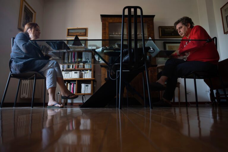 Σε ένα γραφείο, μέσα σε χαρτοκούτια, βρίσκονται οι φάκελοι των ασθενών. Από εκεί ενημερώνεται ποιος έζησε και ποιος πέθανε όσο έλειπε. Δύο κουτιά φέρουν την ένδειξη «εξιτήριο». Το τρίτο γράφει «νεκροί».Ο γιατρός Τζιοβάνι Πασέρι μιλάει στο τηλέφωνο μπροστά σε ένα γραφείο γεμάτο από φακέλους των νέων ασθενών με κορονοϊό στο νοσοκομείο. (AP Photo /Domenico Stinellis)Αλλαγή βάρδιας και ενημέρωση στο νοσοκομείο Ματζόρε. (AP Photo /Domenico Stinellis)Ενώ εξετάζει έναν νέο ασθενή που εισήλθε στη μονάδα του με βαριά συμπτώματα κορονοϊού, ετών 55. (AP Photo/Domenico Stinellis)Με τον Μάριο, 82χρονο ασθενή του, ενώ εκείνος διαβάζει τις οδηγίες του γιατρού, μη μπορώντας να τον ακούσει λόγω του έντονου ήχου του αναπνευστήρα. Από την ημέρα της εισαγωγής του στο νοσοκομείο, στις 28 Μαρτίου, η κατάσταση της υγείας του Μάριο χειροτέρευε συνεχώς. Πέθανε το απόγευμα της 14ης Απριλίου. (AP Photo/Domenico Stinellis)Ο γιατρός ενώ μιλάει με έναν 62χρονο ασθενή του που μόλις έχει βγει από την μηχανική υποστήριξη και αναπνέει κανονικά. Με σπασμένη φωνή λέει στον Πασέρι: «Χάρη σε εσάς είμαι ακόμη εδώ. Είστε οι άγγελοί μου». Μετά μεταφέρθηκε μαζί με άλλους ασθενείς στην ανάρρωση σε ένα κοντινό ξενοδοχείο. (AP Photo/Domenico Stinellis)Μικρή ξεκούραση πριν πάει ξανά στους ασθενείς του. Το κιβώτιο δίπολα του έχει τους φακέλους των ασθενών που κατέληξαν. (AP Photo/Domenico Stinellis)Το τέλος της βάρδιας. Ο Πασέρι αφαιρεί με προσοχή ένα-ένα όλα αυτά που τον προστατεύουν από την επαφή του με τον ιό. Δεν πρέπει καμία από τις μολυσμένες πλέον προστατευτικές στολές του να ακουμπήσουν το δέρμα του. (AP Photo/Domenico Stinellis)Ο Πασέρι χωρίς στολή και μάσκα, εξουθενωμένος από μια ακόμη βάρδια. (AP Photo/Domenico Stinellis)Στο σπίτι του, η τελευταία ιεροτελεστία για να διασφαλίσει την ασφάλεια της οικογένειάς του. (AP Photo/Domenico Stinellis)Ο χαιρετισμός του γιου του από απόσταση. έχει εφαρμόσει ένα δικό του πρωτόκολλο για να είναι σίγουρος ότι δεν θα μεταδώσει ο ίδιος τον ιό στον 10χρονο γιο του και την γυναίκα του. (AP Photo/Domenico Stinellis)Όταν ο Πασέρι αισθάνεται ότι η συναισθηματική πίεση αυξάνεται στον γιο του, παίζουν μαζί χαρτιά. Κάθε φορά όμως φοράνε και οι δύο μάσκα. (AP Photo/Domenico Stinellis) (AP Photo/Domenico Stinellis) (AP Photo/Domenico Stinellis)Κάθεται μόνος του στο τραπέζι για να φάει, στο πλαίσιο των προστατευτικών μέτρων που παίρνει για την οικογένειά του. (AP Photo/Domenico Stinellis)Εκείνη τη νύχτα, θα ξαπλώσει στην απομονωμένη κρεβατοκάμαρα μόνος του, στην «απομόνωσή του» με ένα βιβλίο παρέα που θα τον οδηγήσει σε ένα απαραίτητο ύπνο, για να ξυπνήσει ξανά σε λίγες ώρες και να επαναλάβει για μια ακόμη φορά τον ηρωικό του ρόλο στο νοσοκομείο μαζί με τους συναδέλφους και ενταχθεί για άλλη μια φορά στους συναδέλφους του ιατρικούς πολεμιστές. (AP Photo/Domenico Stinellis)