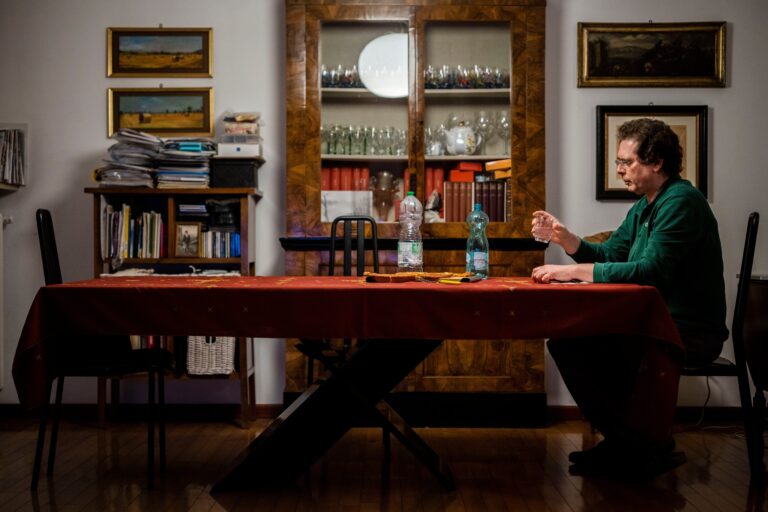Σε ένα γραφείο, μέσα σε χαρτοκούτια, βρίσκονται οι φάκελοι των ασθενών. Από εκεί ενημερώνεται ποιος έζησε και ποιος πέθανε όσο έλειπε. Δύο κουτιά φέρουν την ένδειξη «εξιτήριο». Το τρίτο γράφει «νεκροί».ASSOCIATED PRESSΟ γιατρός Τζιοβάνι Πασέρι μιλάει στο τηλέφωνο μπροστά σε ένα γραφείο γεμάτο από φακέλους των νέων ασθενών με κορονοϊό στο νοσοκομείο. (AP Photo /Domenico Stinellis)ASSOCIATED PRESSΑλλαγή βάρδιας και ενημέρωση στο νοσοκομείο Ματζόρε. (AP Photo /Domenico Stinellis)ASSOCIATED PRESSΕνώ εξετάζει έναν νέο ασθενή που εισήλθε στη μονάδα του με βαριά συμπτώματα κορονοϊού, ετών 55. (AP Photo/Domenico Stinellis)ASSOCIATED PRESSΜε τον Μάριο, 82χρονο ασθενή του, ενώ εκείνος διαβάζει τις οδηγίες του γιατρού, μη μπορώντας να τον ακούσει λόγω του έντονου ήχου του αναπνευστήρα. Από την ημέρα της εισαγωγής του στο νοσοκομείο, στις 28 Μαρτίου, η κατάσταση της υγείας του Μάριο χειροτέρευε συνεχώς. Πέθανε το απόγευμα της 14ης Απριλίου. (AP Photo/Domenico Stinellis)ASSOCIATED PRESSΟ γιατρός ενώ μιλάει με έναν 62χρονο ασθενή του που μόλις έχει βγει από την μηχανική υποστήριξη και αναπνέει κανονικά. Με σπασμένη φωνή λέει στον Πασέρι: «Χάρη σε εσάς είμαι ακόμη εδώ. Είστε οι άγγελοί μου». Μετά μεταφέρθηκε μαζί με άλλους ασθενείς στην ανάρρωση σε ένα κοντινό ξενοδοχείο. (AP Photo/Domenico Stinellis)ASSOCIATED PRESSΜικρή ξεκούραση πριν πάει ξανά στους ασθενείς του. Το κιβώτιο δίπολα του έχει τους φακέλους των ασθενών που κατέληξαν. (AP Photo/Domenico Stinellis)ASSOCIATED PRESSΤο τέλος της βάρδιας. Ο Πασέρι αφαιρεί με προσοχή ένα-ένα όλα αυτά που τον προστατεύουν από την επαφή του με τον ιό. Δεν πρέπει καμία από τις μολυσμένες πλέον προστατευτικές στολές του να ακουμπήσουν το δέρμα του. (AP Photo/Domenico Stinellis)ASSOCIATED PRESSΟ Πασέρι χωρίς στολή και μάσκα, εξουθενωμένος από μια ακόμη βάρδια. (AP Photo/Domenico Stinellis)ASSOCIATED PRESSΣτο σπίτι του, η τελευταία ιεροτελεστία για να διασφαλίσει την ασφάλεια της οικογένειάς του. (AP Photo/Domenico Stinellis)ASSOCIATED PRESSΟ χαιρετισμός του γιου του από απόσταση. έχει εφαρμόσει ένα δικό του πρωτόκολλο για να είναι σίγουρος ότι δεν θα μεταδώσει ο ίδιος τον ιό στον 10χρονο γιο του και την γυναίκα του. (AP Photo/Domenico Stinellis)ASSOCIATED PRESSΌταν ο Πασέρι αισθάνεται ότι η συναισθηματική πίεση αυξάνεται στον γιο του, παίζουν μαζί χαρτιά. Κάθε φορά όμως φοράνε και οι δύο μάσκα. (AP Photo/Domenico Stinellis)ASSOCIATED PRESS (AP Photo/Domenico Stinellis)ASSOCIATED PRESS (AP Photo/Domenico Stinellis)ASSOCIATED PRESSΚάθεται μόνος του στο τραπέζι για να φάει, στο πλαίσιο των προστατευτικών μέτρων που παίρνει για την οικογένειά του. (AP Photo/Domenico Stinellis)ASSOCIATED PRESSΕκείνη τη νύχτα, θα ξαπλώσει στην απομονωμένη κρεβατοκάμαρα μόνος του, στην «απομόνωσή του» με ένα βιβλίο παρέα που θα τον οδηγήσει σε ένα απαραίτητο ύπνο, για να ξυπνήσει ξανά σε λίγες ώρες και να επαναλάβει για μια ακόμη φορά τον ηρωικό του ρόλο στο νοσοκομείο μαζί με τους συναδέλφους και ενταχθεί για άλλη μια φορά στους συναδέλφους του ιατρικούς πολεμιστές. (AP Photo/Domenico Stinellis)ASSOCIATED PRESS