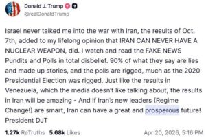 «Παρακολουθώ και διαβάζω τα fake news των ειδικών και των δημοσκοπήσεων και δεν τα πιστεύω. Το 90% αυτών που λένε είναι ψέματα και ιστορίες που έπλασαν οι ίδιοι και οι δημοσκοπήσεις είναι στημένες, όπως στημένες ήταν και οι προεδρικές εκλογές του 2020. Όπως και τα αποτελέσματα στη Βενεζουέλα, για τα οποία δεν αρέσει στα ΜΜΕ να μιλάνε, τα αποτελέσματα στο Ιράν θα είναι εκπληκτικά. Και αν οι νέοι ηγέτες του Ιράν (αλλαγή καθεστώτος!) είναι έξυπνοι, το Ιράν μπορεί να έχει ένα μεγάλο και επιτυχημένο μέλλον!» πρόσθεσε.