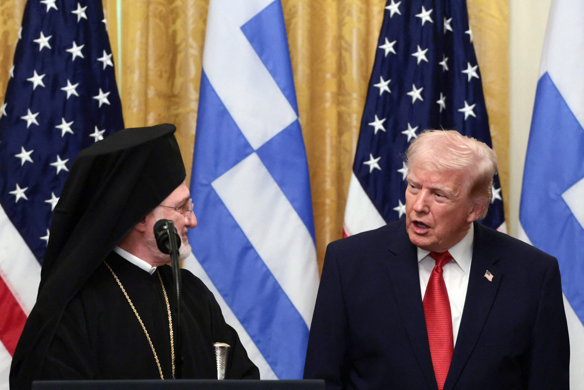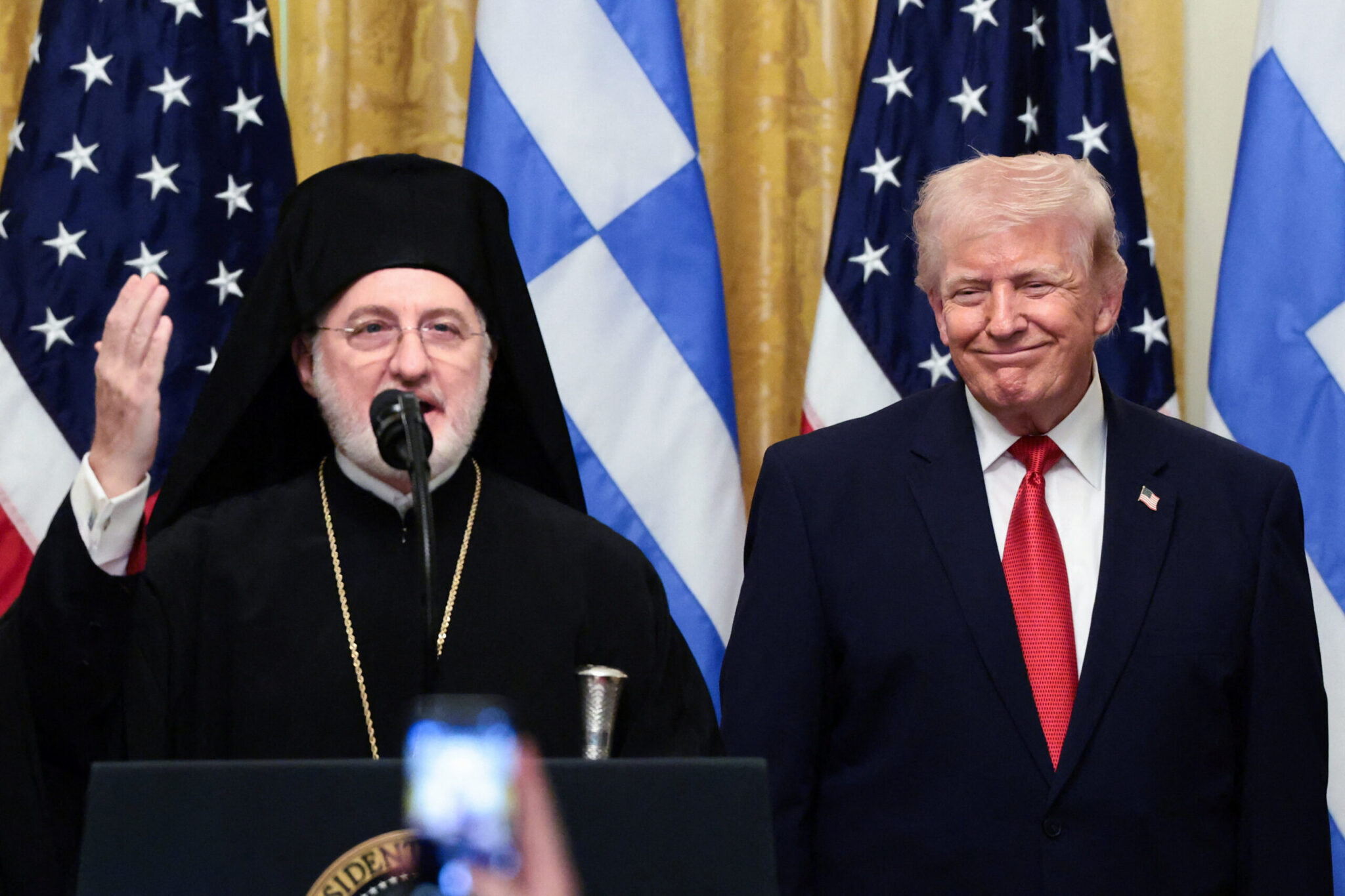 «Ευχαριστούμε για την υποστήριξή σας στο κυπριακό ζήτημα. Σε όλες τις εκκλησίες προσευχόμαστε για όλες τις ένοπλες δυνάμεις. Όλοι αναρωτιούνται τι θα σας προσφέρω μετά τον σταυρό που σας προσέφερα πέρσι. Θα κλείσω με μια ειδική προσευχή που λέμε κάθε Κυριακή πριν από το Πάσχα. Την προσευχή του Αγίου Βασιλείου» τόνισε ο Αρχιεπίσκοπος Ελπιδοφόρος και είπε την προσευχή ενώ ο Ντόναλντ Τραμπ στεκόταν δίπλα του.