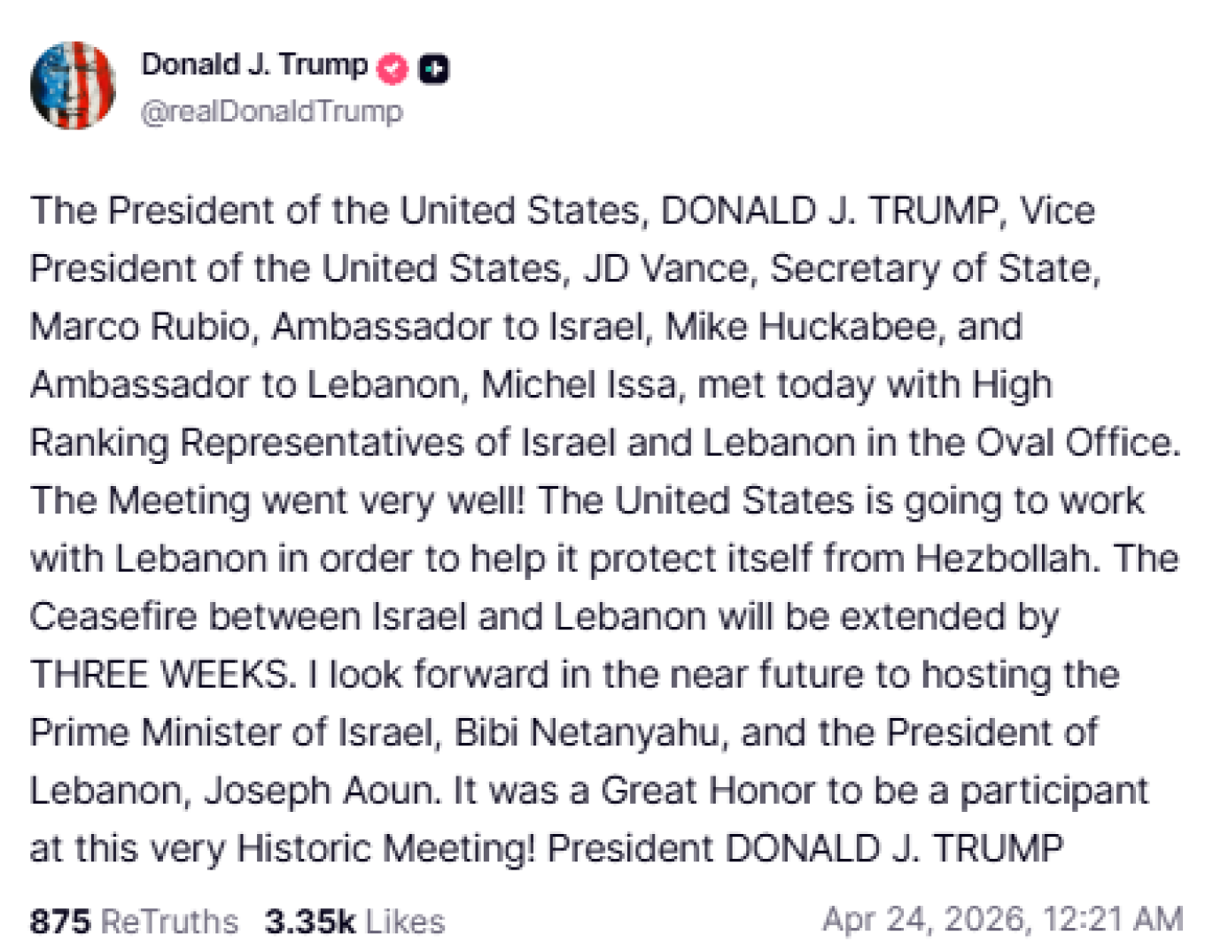 «Ο Πρόεδρος των Ηνωμένων Πολιτειών, Ντόναλντ Τζ. Τραμπ, ο Αντιπρόεδρος των Ηνωμένων Πολιτειών, Τζέι Ντι Βανς, ο Υπουργός Εξωτερικών, Μάρκο Ρούμπιο, ο Πρέσβης των ΗΠΑ στο Ισραήλ, Μάικ Χάκαμπι, και ο Πρέσβης των ΗΠΑ στον Λίβανο, Μισέλ Ίσα, συναντήθηκαν σήμερα με υψηλόβαθμους εκπροσώπους του Ισραήλ και του Λιβάνου στο Οβάλ Γραφείο.