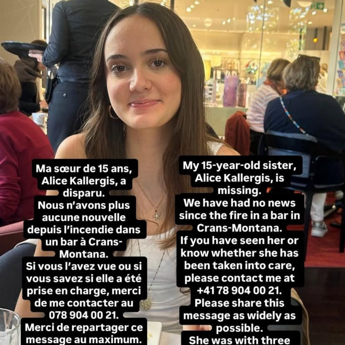 «Δεν έχουμε καμία πληροφορία για εκείνη μετά τη φωτιά στο μπαρ στο Κραν Μοντανά.Παρακαλεί ακόμη όποιον γνωρίζει κάτι να επικοινωνήσει στο παρακάτω τηλέφωνο: +41789040021» αναφέρει στην ανάρτησή του.