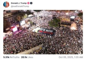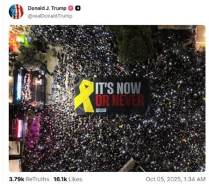 Ο Τραμπ ανέβασε επίσης φωτογραφίες από συγκέντρωση για την επιστροφή των ομήρων στο Τελ Αβίβ, όπου φαίνεται πανό το οποίο γράφει πάνω του «It’s now or never» (ή τώρα ή ποτέ).