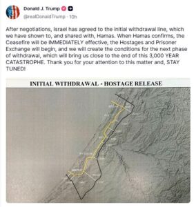 «Μετά τις διαπραγματεύσεις, το Ισραήλ συμφώνησε στην αρχική γραμή απόσυρσης, την οποία δείξαμε και μοιραστήκαμε με τη Χαμάς. Όταν επιβεβαιώσει η Χαμάς, η εκεχειρία θα τεθεί σε ισχύ άμεσα, η ανταλλαγή ομήρων και κρατουμένων θα αρχίσει και θα δημιουργήσουμε τις συνθήκες για την επόμενη φάση της απόσυρσης, που θα μας φέρει κοντά στο τέλος αυτής της 3.000 ετών καταστροφής. Σας ευχαριστώ για την προσοχή σας στο θέμα αυτό και μείνετε συντονισμένοι!» έγραψε σχετικά σε ανάρτησή του, που συνοδεύεται από χάρτη.