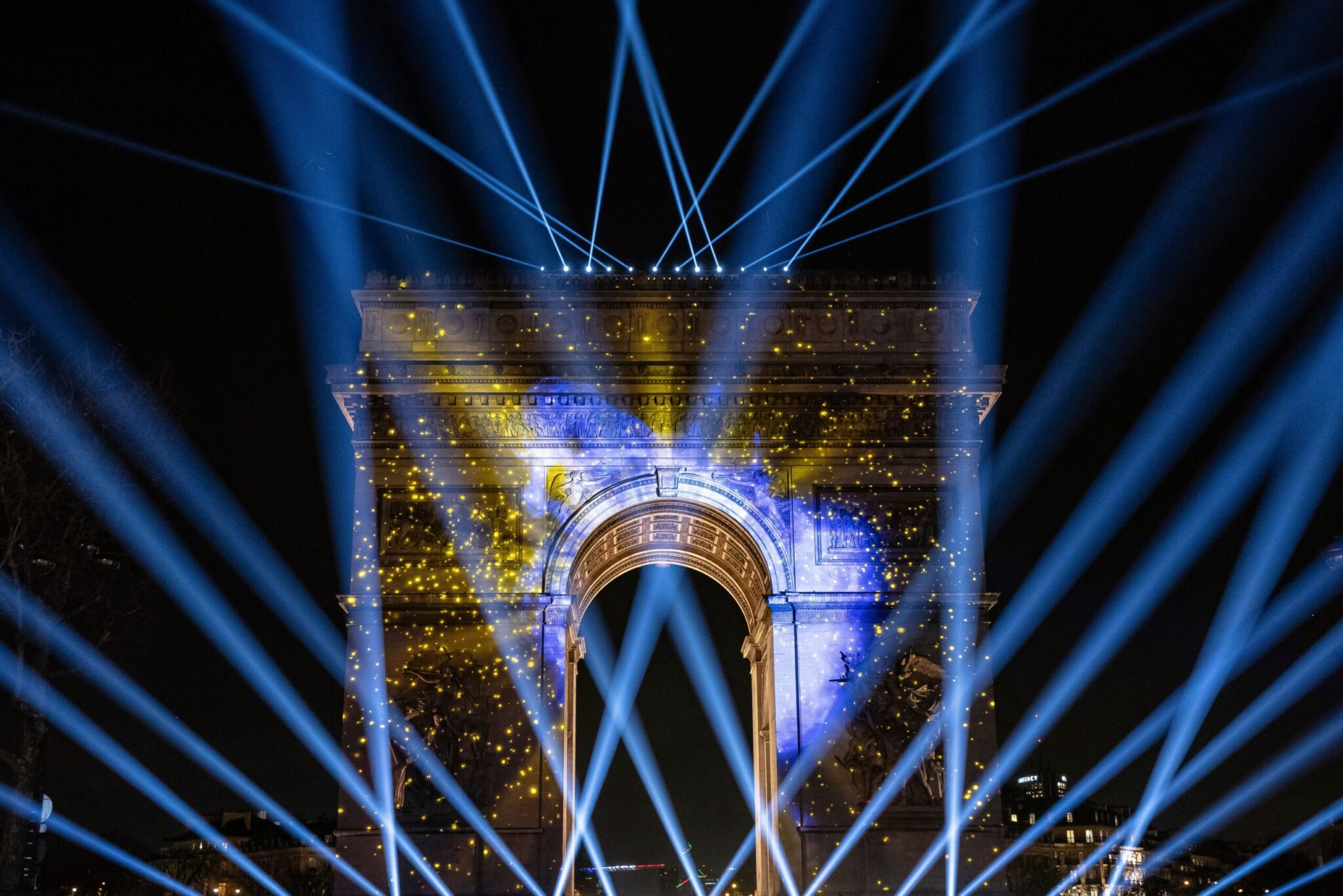 ΑΡΧΕΙΟ – Ένα φωτεινό σόου στην Αψίδα του Θριάμβου κατά τη διάρκεια ενός πρωτοχρονιάτικου εορτασμού στα Ηλύσια Πεδία στο Παρίσι, Γαλλία, την Κυριακή 31 Δεκεμβρίου 2023. (AP Photo/Aurelien Morissard, File)via Associated Press
