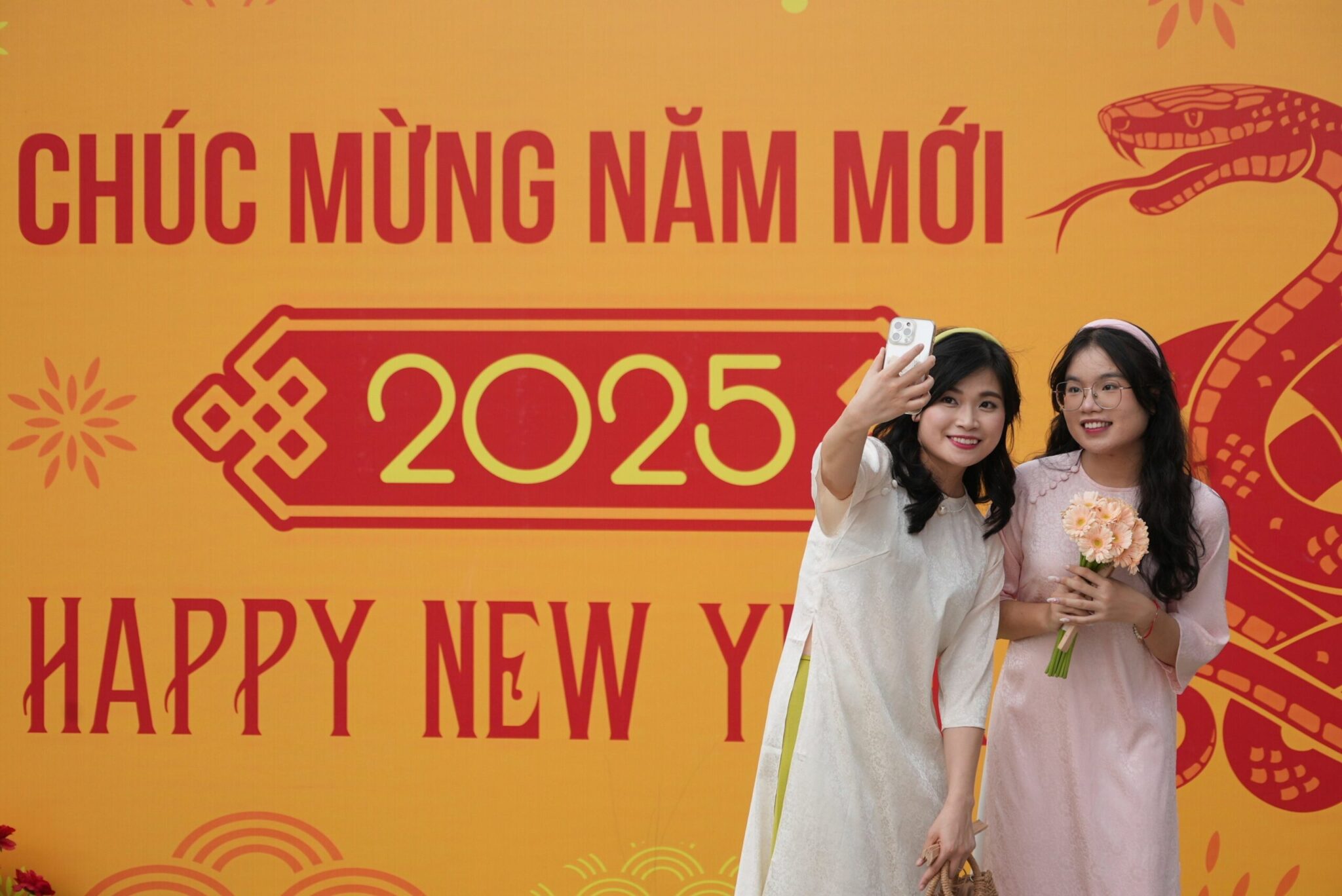 Νεαρές γυναίκες με βιετναμέζικες παραδοσιακές φορεσιές βγάζουν selfie για το Νέο Έτος στην πρωτεύουσα Χο Τσι Μινχ, Βιετνάμ, την Τρίτη 31 Δεκεμβρίου 2024. (AP Photo/Hau Dinh)via Associated Press