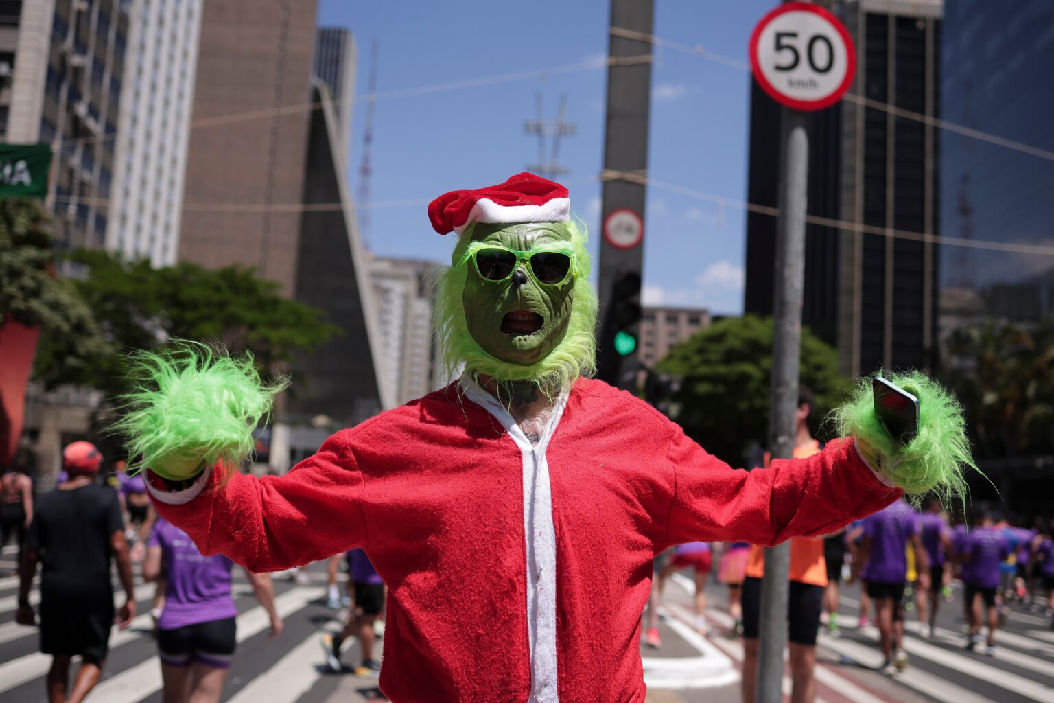 Ένας δρομέας με στολή αγωνίζεται στον αγώνα δρόμου Sao Silvestre στο Σάο Πάολο, Τρίτη 31 Δεκεμβρίου 2024. Ο αγώνας δρόμου 15 χιλιομέτρων διεξάγεται κάθε χρόνο την παραμονή της Πρωτοχρονιάς. (AP Photo/Ettore Chiereguini)via Associated Press