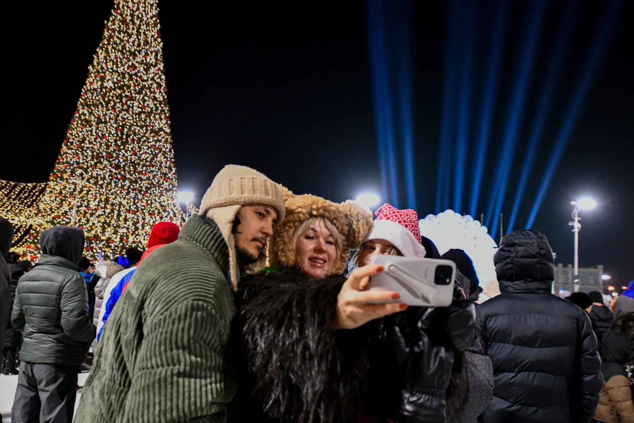 Ένα ζευγάρι βγάζει selfie καθώς άλλοι άνθρωποι συγκεντρώνονται στο κέντρο του ρωσικού λιμανιού του Βλαδιβοστόκ, Ρωσία, Τρίτη 31 Δεκεμβρίου 2024, για να γιορτάσουν το νέο έτος 2025. Μακριά από το πολεμικό μέτωπο της Ουκρανίας, όπου ρωσικές επιθέσεις συνεχίζονται και σήμερα… (AP Photo)via Associated PressPeople make a selfie as they gather in the center of the Russian far east port Vladivostok, Russia, Tuesday, Dec. 31, 2024, to celebrate the new year. (AP Photo)via Associated Press