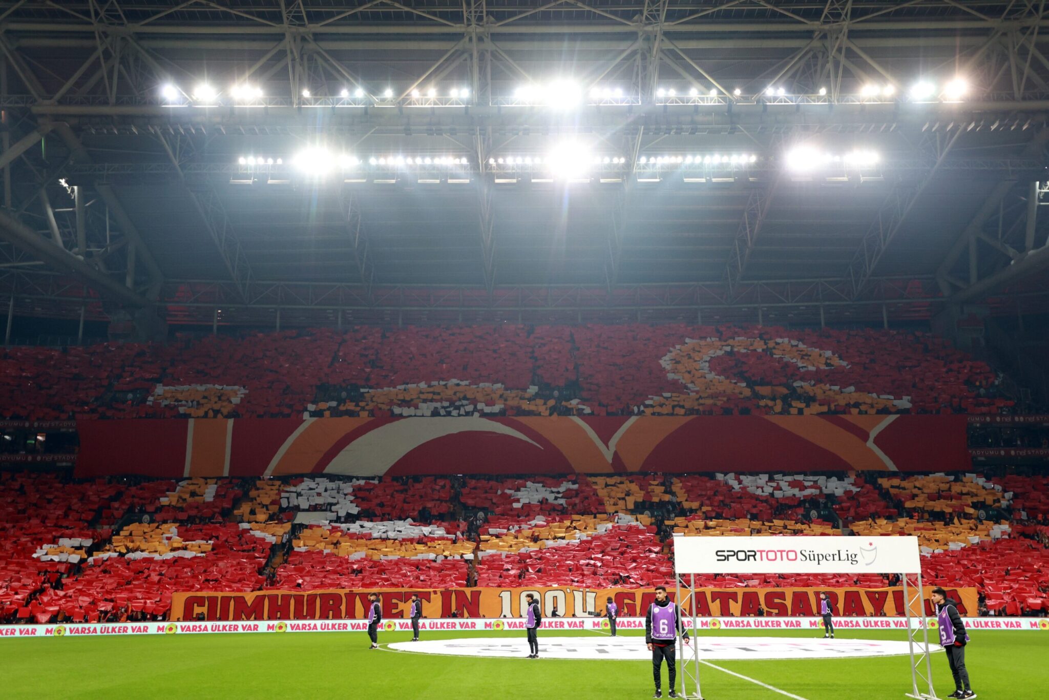 Η «υπερπαραγωγή» έγινε πριν από τον αγώνα της Γαλατασαράι με την Αλάνιασπορ για την 11η αγωνιστική του τουρκικού πρωταθλήματος ποδοσφαίρου, στις κερκίδες του κατάμεστου γηπέδου «Αλί Σαμί Γεν» και η «χορογραφία» των οπαδών για τα 100 χρόνια της Δημοκρατίας της Τουρκίας καταχειροκροτήθηκε.
