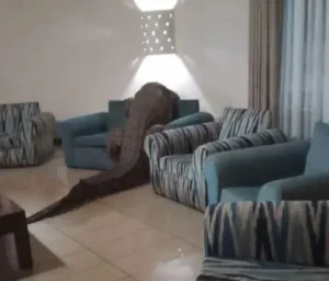 Το μεγάλο ερπετό τελικά γλίστρησε πάλι προς τα κάτω και κάθισε σε έναν από τους καναπέδες του σαλονιού!