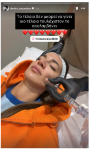 Το πρώην μοντέλο ανέβασε ένα story στο προφίλ του στο Instagram την Τρίτη 28 Απριλίου κατά το οποίο η τραγουδίστρια φαίνεται πως δοκίμαζε μία θεραπεία προσώπου στο μαγαζί που διατηρεί ο ίδιος.