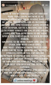 Όπως έγραψε στην ανάρτησή της στο Instagram: «Αν δυσκολεύεσαι αυτήν την ημέρα περισσότερο από το συνηθισμένο επειδή είναι Ημέρα των Ευχαριστιών και αυτές οι γιορτινές μέρες μπορεί να είναι ιδιαίτερα δύσκολες για εμάς τους αλκοολικούς, πριν βρεθείς να βυθίζεσαι ακόμη πιο βαθιά στην απόγνωση, πήγαινε σε μια συνάντηση όπως πηγαίνω κι εγώ ή μπες σε μία διαδικτυακά».