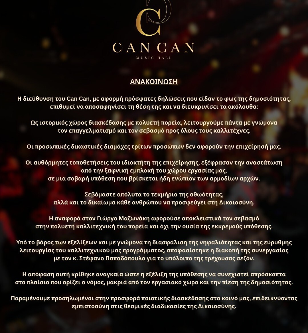 Λίγες ώρες μετά τη δημόσια τοποθέτηση του ιδιοκτήτη του Can Can, ακολούθησε στο instagram του νυχτερινού κέντρου μια σαφώς πιο προσεκτικά διατυπωμένη ανακοίνωση αιτιολογώντας την απομάκρυνση του Στέφανου Παπαδόπουλου προκειμένου να διασφαλιστεί η ομαλή λειτουργία της επιχείρησης: