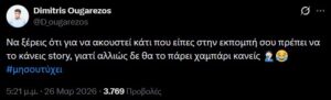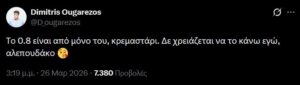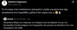 Η ανάρτηση αυτή έκανε τον Δημήτρη Ουγγαρέζο να απασφαλίσει κανονικά, αυτή τη φορά μέσω της πλατφόρμας X με ένα ακόμα πιο δηλητηριώδες tweet: