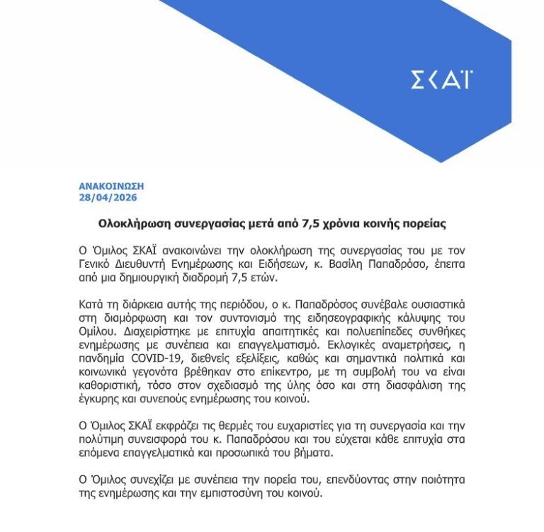 «Όπως όλες τις δουλειές, έτσι και τη δική μας, την κάνουν οι άνθρωποι. Για αυτό και η σημερινή μέρα είναι δύσκολη για μένα, καθώς είναι η τελευταία του Βασίλη Παπαδρόσου ως Γενικού Διεθυντή ειδήσεων και ενημέρωσης στον ΣΚΑΪ μετά από σχεδόν οκτώ πυκνά και δημιουργικά χρόνια με πολλές και μεγάλες επιτυχίες.