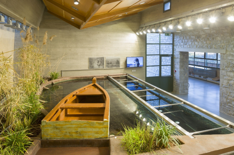Εσωτερική άποψη του Μουσείου Περιβάλλοντος Στυμφαλίας. Διακρίνεται το ανοιχτό ενυδρείο, το οποίο αναπαριστά τη λίμνη σε τομή με ψάρια και φυτά της περιοχής ΠΙΟΠ, Ν. Δανιηλίδης