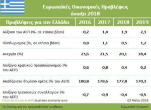Ειδικότερα οι προβλέψεις αναφέρουν ότι ”η οικονομία της Ελλάδας αυξήθηκε κατά 1,4 % το περασμένο έτος και σηματοδοτεί την πρώτη φορά που η αύξηση του πραγματικού ΑΕΠ υπερβαίνει το 1 % από το 2007. Η οικονομική ανάκαμψη αναμένεται να επιταχυνθεί, εφόσον το πρόγραμμα στήριξης της σταθερότητας ολοκληρωθεί επιτυχώς. Η ανεργία αναμένεται να πέσει κάτω από το 20 % έως το 2019, για πρώτη φορά από το 2011. Με δημοσιονομικό πλεόνασμα το 2017, για δεύτερο κατά σειρά έτος, η Ελλάδα βρίσκεται σε καλό δρόμο για την επίτευξη του στόχου για πρωτογενές πλεόνασμα ποσοστού 3,5 % του ΑΕΠ τόσο το 2018 όσο και το 2019″.