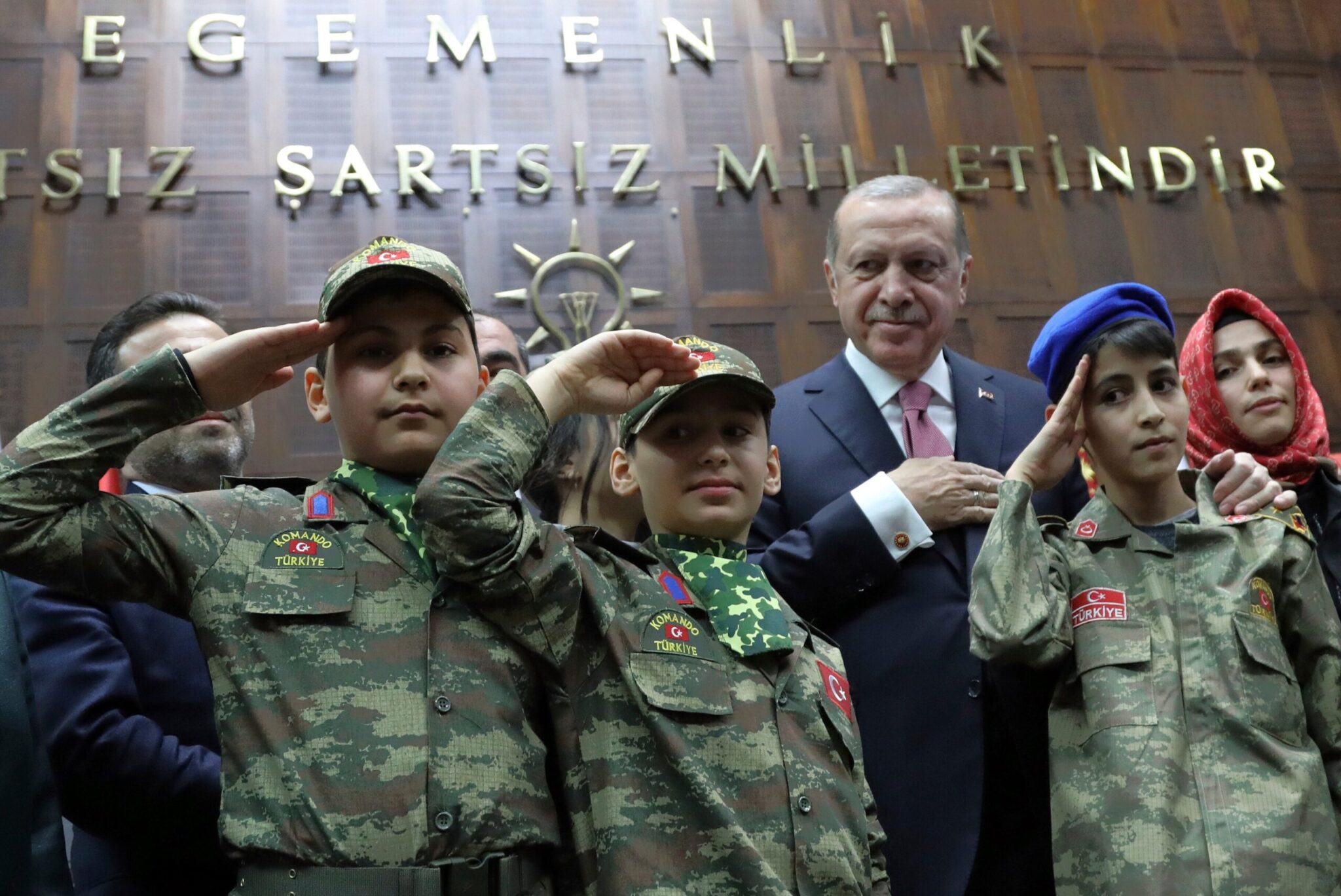 Η εικόνα όμως που κυριολεκτικά και μεταφορικά είχε παγώσει τη Δύση ήταν η στρατολόγηση ενός μικρού κοριτσιού τον Φεβρουάριο του 2018.Το εξάχρονο παιδάκι, ντυμένο με στρατιωτική στολή και φορώντας στο κεφάλι τον μπορντό μπερέ των επίλεκτων δυνάμεων του τουρκικού στρατού, εμφανίστηκε στο πόντιουμ του συνεδρίου του κόμματος του Ερντογάν, όπου ο ίδιος μίλησε στους οπαδούς του κυρίως για την στρατιωτική επιχείρηση που τότε πραγματοποιούσε η Τουρκία κατά των Κούρδων στο Αφρίν της Συρίας. Η μικρούλα δεν μπορούσε να συγκρατήσει τα δάκρυα της με αποτέλεσμα ο Τούρκος πρόεδρος να της δώσει μια σκληρή απάντηση. «Αυτοί που φορούν μπορντό μπερέ δεν κλαίνε» και της υποσχέθηκε ότι εάν μαρτυρήσει, θα τη τιμήσει, θεού θέλοντος, με την τουρκική σημαία.