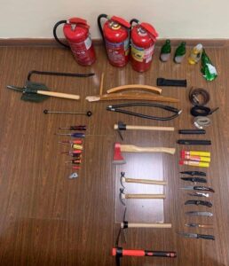 Στην κατοχή ενός εκ των ανωτέρω, βρέθηκε και κατασχέθηκε πυροσβεστήρας και αναδιπλούμενος σουγιάς, ενώ οι υπόλοιποι στη θέα των αστυνομικών απέρριψαν στο οδόστρωμα: