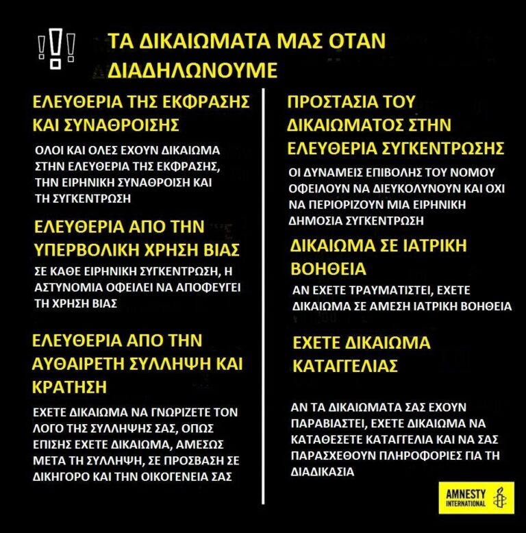 Η Διεθνής Αμνηστία εκφράζει σοβαρές ανησυχίες για διάφορες διατάξεις στο νομοσχέδιο για τις συναθροίσεις, που ψηφίζεται σήμερα στη Βουλή, οι οποίες εάν εγκριθούν, «θα αποτελέσουν αδικαιολόγητη παρέμβαση στο δικαίωμα στην ελευθερία της ειρηνικής συνάθροισης, όπως διασφαλίζεται από τις διεθνείς και περιφερειακές συνθήκες στις οποίες συμμετέχει η Ελλάδα, συμπεριλαμβανομένων του Διεθνούς Συμφώνου για τα Ατομικά και Πολιτικά Δικαιώματα (ICCPR) και της Ευρωπαϊκής Σύμβασης Δικαιωμάτων του Ανθρώπου (ΕΣΔΑ)».