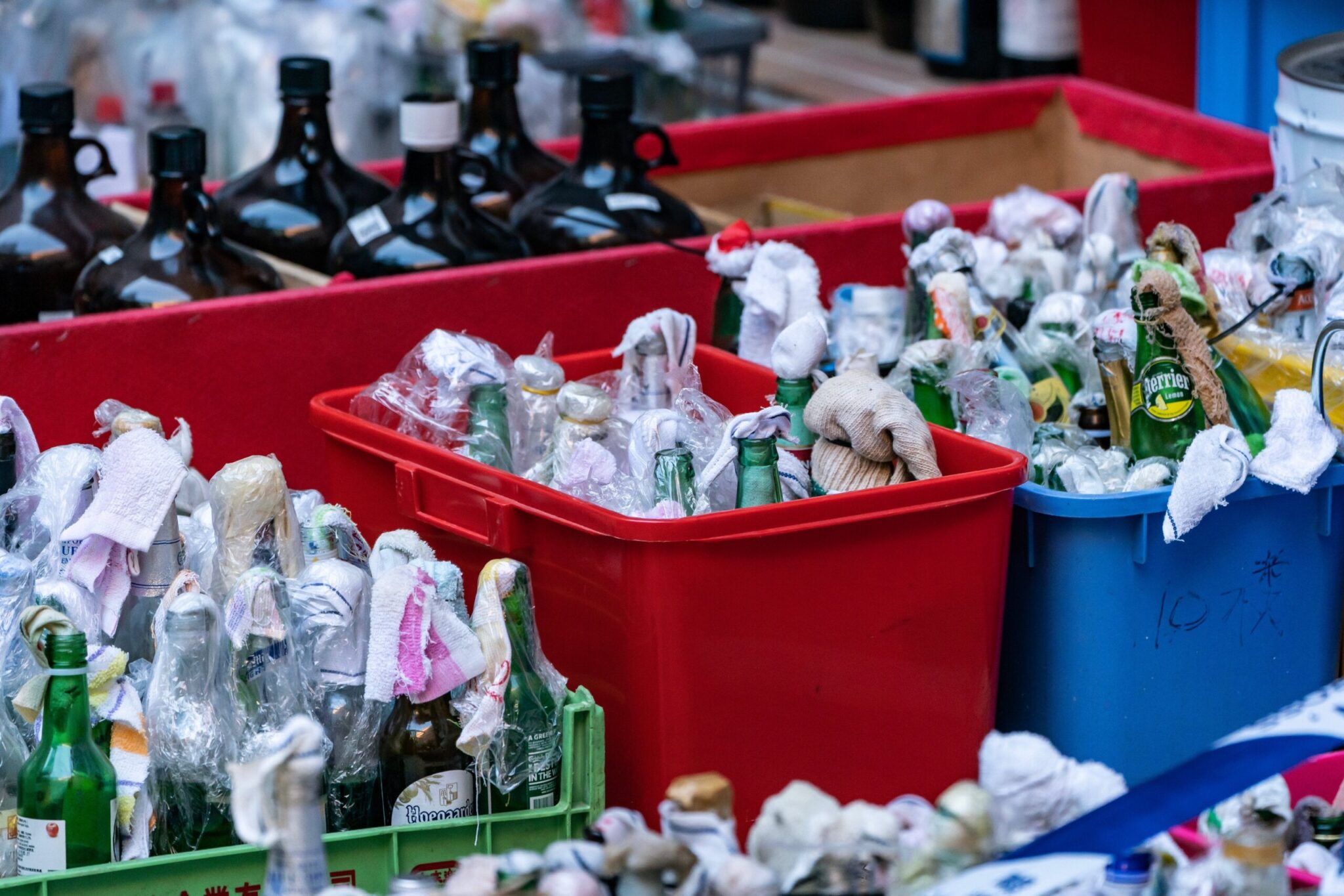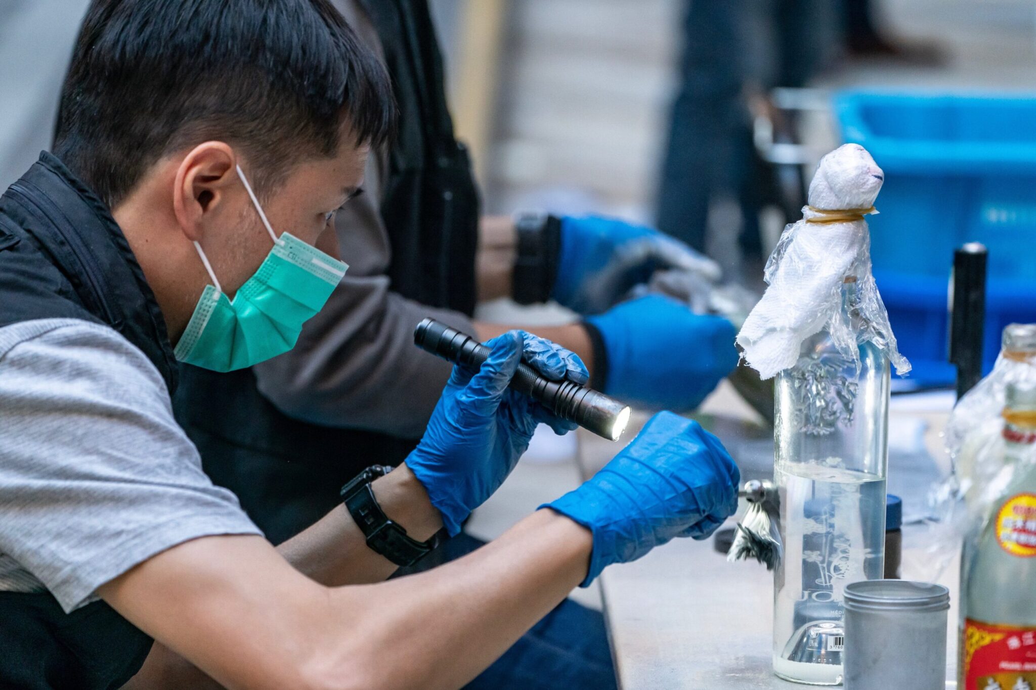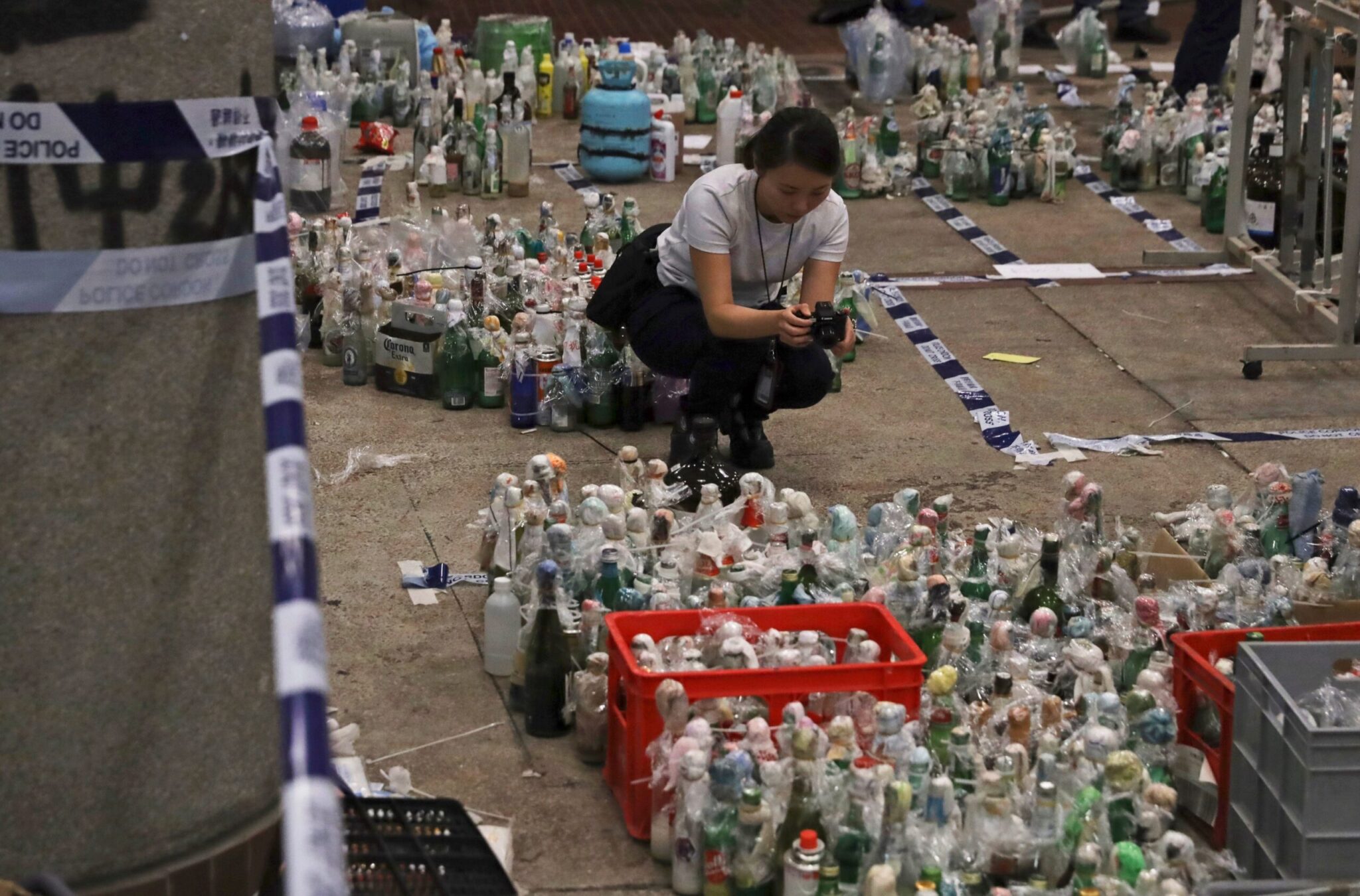 Συγκέντρωσαν σε μια αυλή μισογεμάτα μπιτόνια βενζίνης, βόμβες μολότοφ για την κατασκευή των οποίων είχαν χρησιμοποιηθεί μπουκάλια από κρασί και πολλά γυάλινα μπουκάλια που περιείχαν χημικές ουσίες. Τοποθέτησαν ετικέτες σε καθένα από αυτά και στη συνέχεια τα απομάκρυναν.