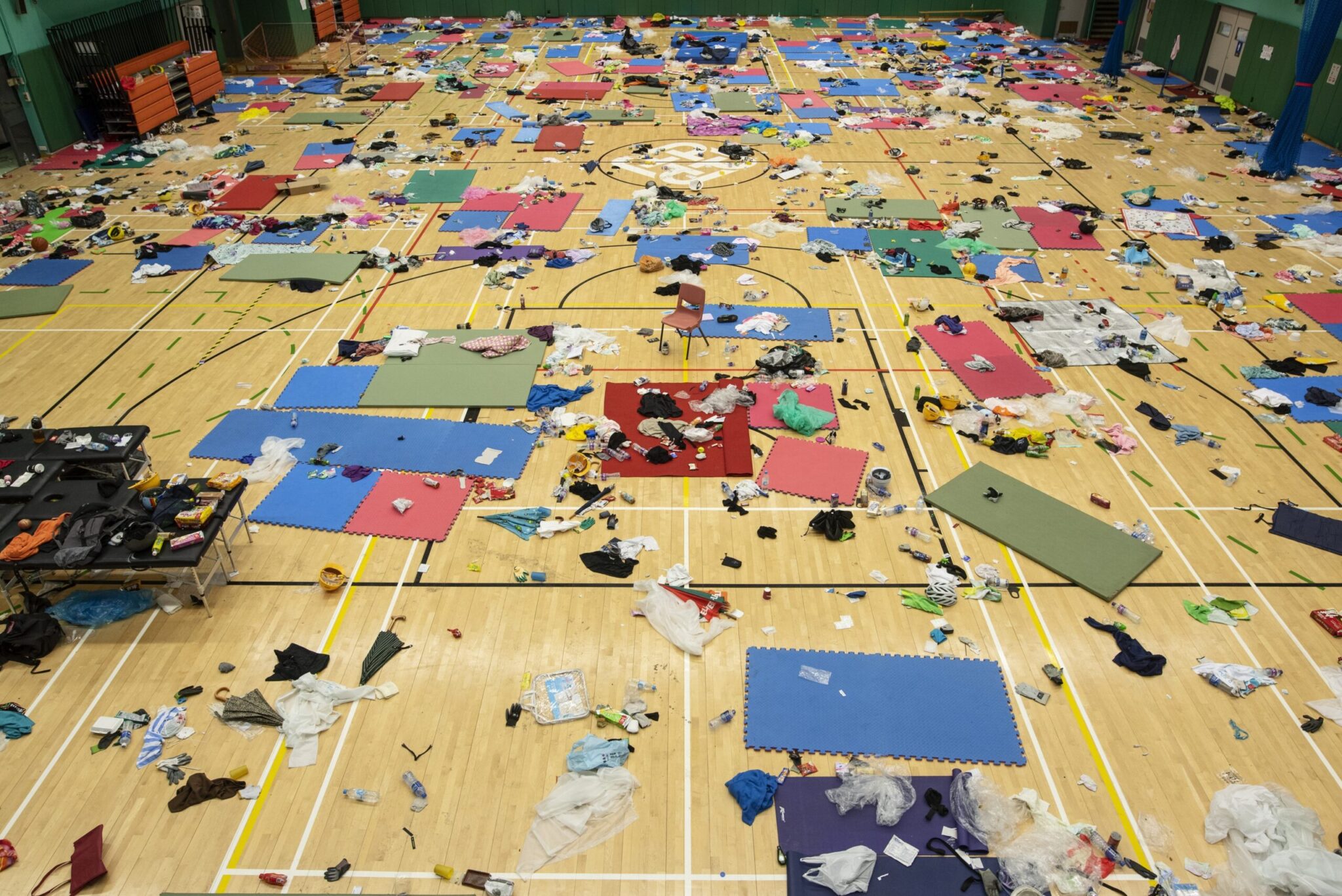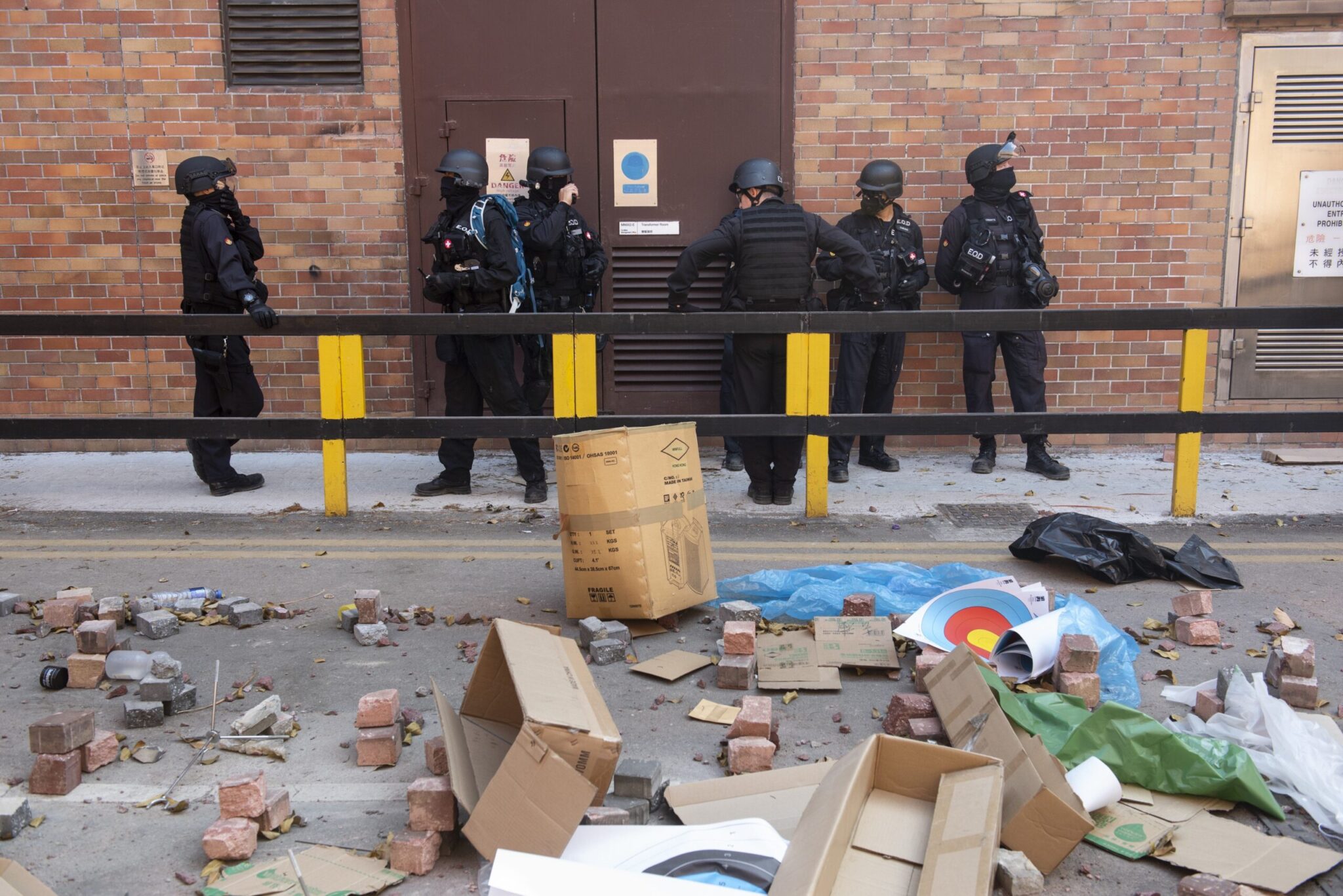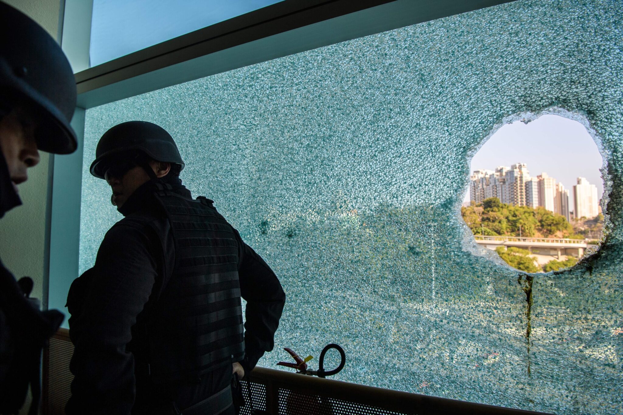 Οι εγκαταστάσεις μοιάζουν πράγματι με πεδίο μάχης γεμάτο κομμάτια από τούβλα ―που οι διαδηλωτές εκτόξευσαν εναντίον των αστυνομικών― μαζί με κράνη, ρούχα και αντιασφυξιογόνες μάσκες.