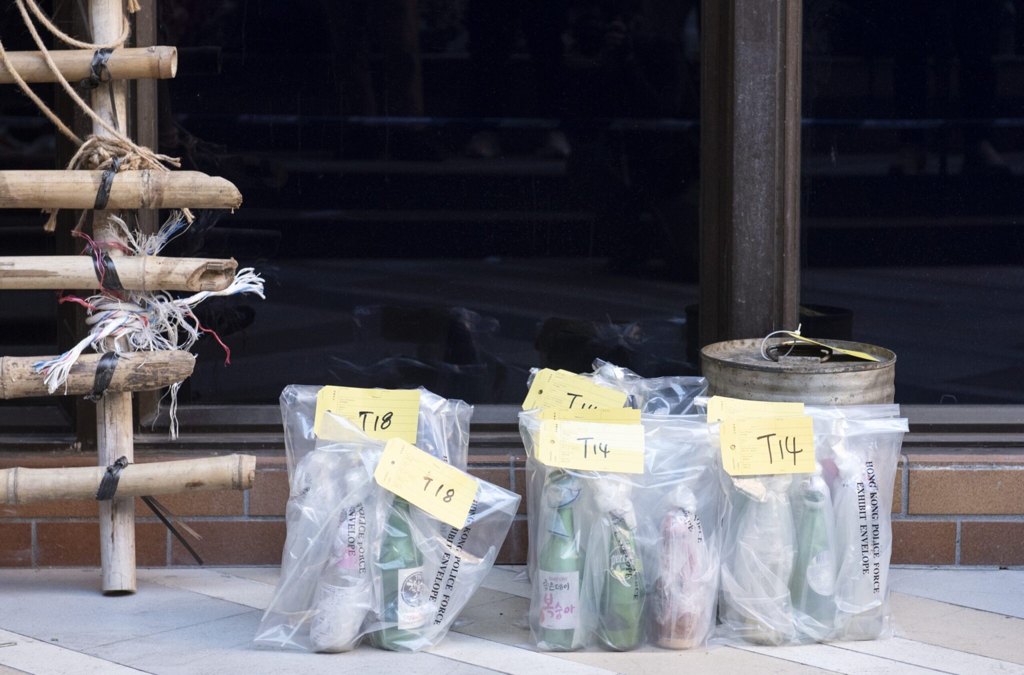 Η αστυνομία κατά των διαδηλώσεων άρχισε σήμερα το πρωί να συγκεντρώνει δεκάδες αυτοσχέδιους εμπρηστικούς μηχανισμούς, τόξα καθώς και μπουκάλες με χημικές ουσίες που είχαν κλαπεί από τα εργαστήρια του πανεπιστημίου.