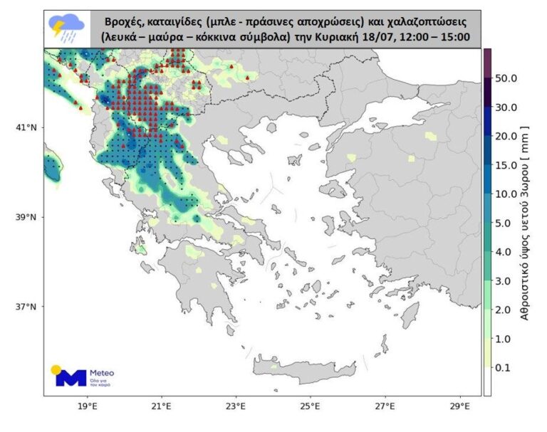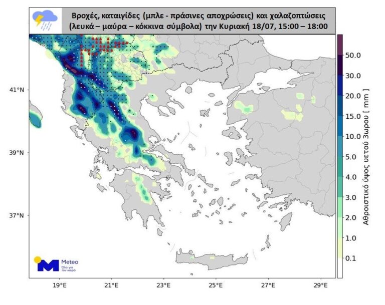 Σύμφωνα με τα προγνωστικά στοιχεία του Εθνικού Αστεροσκοπείου Αθηνών/meteo.gr, βροχές και καταιγίδες αναμένεται να εκδηλωθούν την Κυριακή 18 Ιουλίου, κυρίως σε περιοχές της Δυτικής Μακεδονίας, της Ηπείρου, της Θεσσαλίας και της Κεντρικής Στερεάς. Τα φαινόμενα θα είναι κατά τόπους ισχυρά και σε ορισμένες περιπτώσεις θα συνοδεύονται από χαλαζοπτώσεις, έντονη ηλεκτρική δραστηριότητα και ενισχυμένους ανέμους. Μικρότερης γενικά έντασης φαινόμενα θα εκδηλωθούν επίσης σε περιοχές της Κεντρικής Μακεδονίας και της Πελοποννήσου.