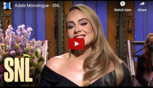 Η Αντέλ θυμήθηκε την πρώτη της εμφάνιση στο SNL, το μακρινό 2008, είπε ότι έχει άγχος στις ζωντανές τηλεοπτικές εμφανίσεις και εξέφρασε ένα «εκ βαθέων, ειλικρινές ευχαριστώ» στους εργαζομένους στην πρώτη γραμμή για την αντιμετώπιση της πανδημίας στην Νέα Υόρκη, κάποιοι εκ των οποίων βρίσκονταν μεταξύ του κοινού της εκπομπής.