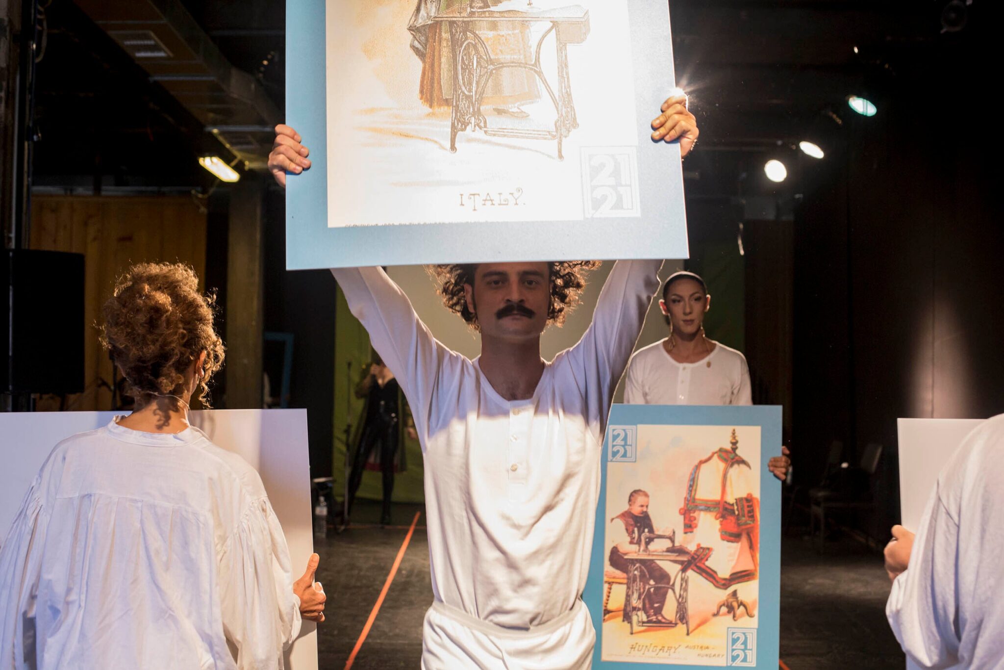 Το Εθνικό ντεφιλέ τοποθετείται στο μέλλον, 300 χρόνια μετά την Επανάσταση. Στο 2121, όπου τα έθνη-κράτη δεν υφίστανται πλέον. Με άξονα την ιστορία του εθνικού ενδύματος και με αναστοχαστική διάθεση, η παράσταση αναρωτιέται πώς θα μπορούσαν οι άνθρωποι να συνθέσουν την ταυτότητά τους πέρα από τα έθνη και πώς θα μπορούσαν να φτιαχτούν άλλες κοινότητες, πιο συμπεριληπτικές.