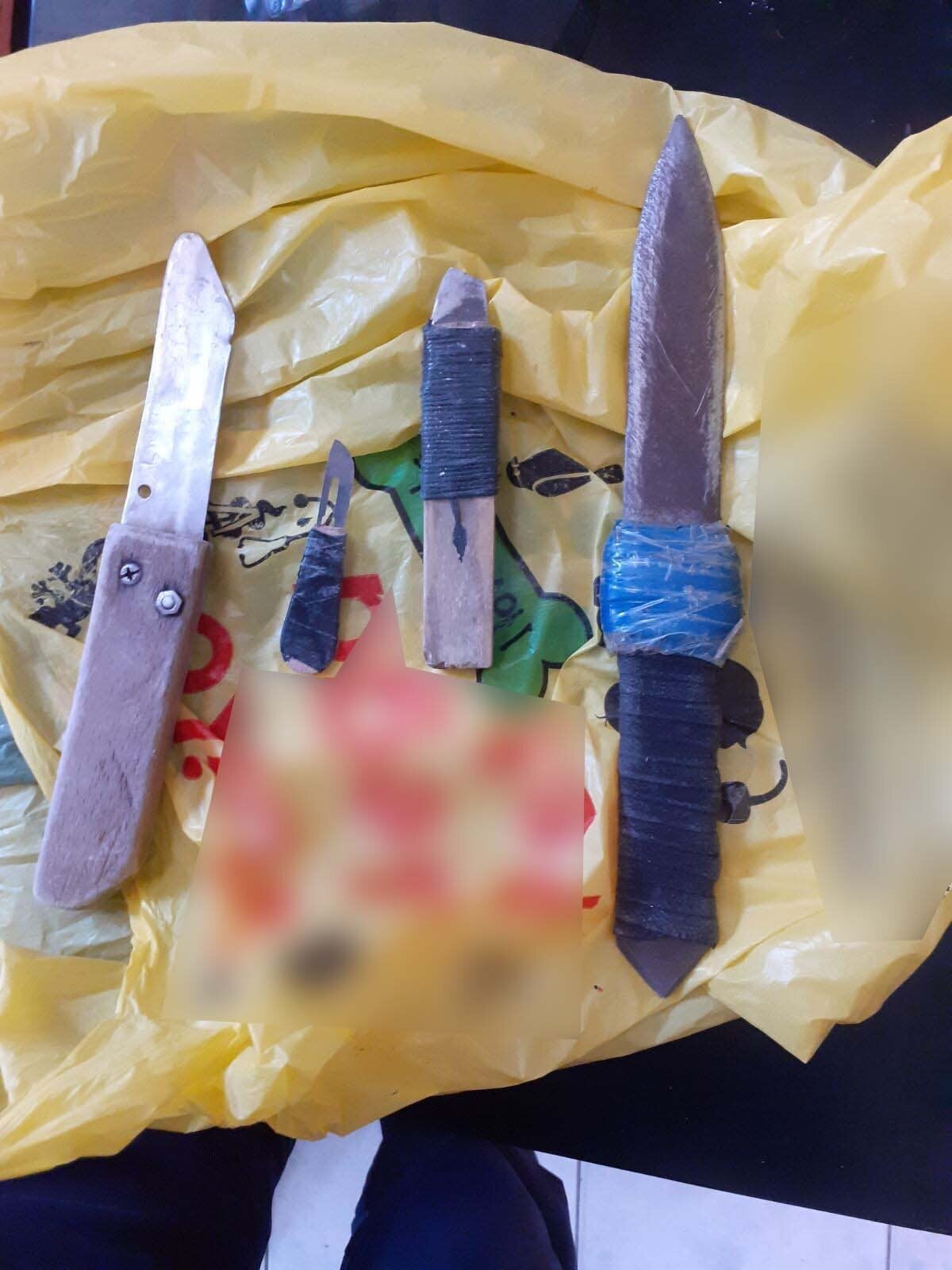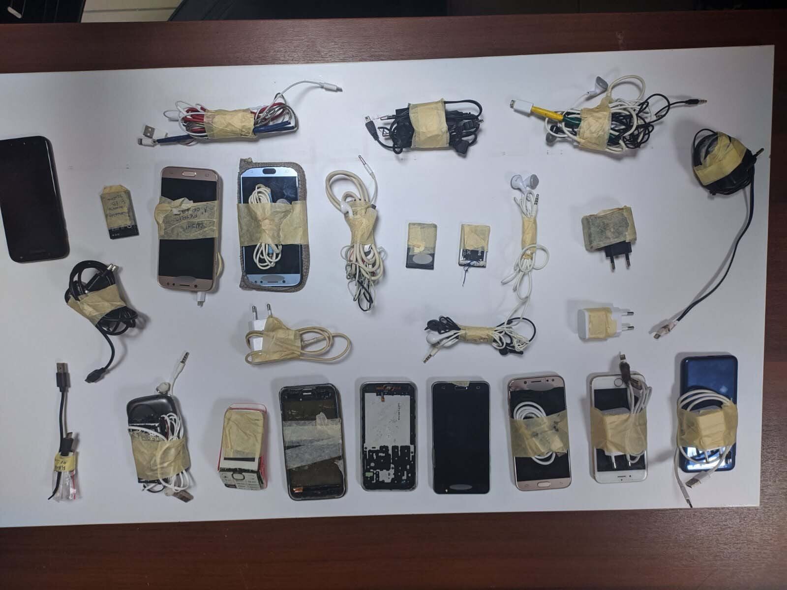 Στις φυλακές Κορυδαλλού η έρευνα έλαβε χώρα χθες Κυριακή, κατά τις βραδινές ώρες, σε αποθήκη πτέρυγας, όπου βρέθηκαν και κατασχέθηκαν: 2 μαχαίρια, αυτοσχέδιο σουβλί, 2 φαλτσέτες και 2 αυτοσχέδια ξυραφάκια, 2 κινητά τηλέφωνα και εξαρτήματα κινητών, 5 φορτιστές , hands free, καλώδια φορτιστών, usb, παιχνιδομηχανή με 2 παιχνίδια, ποντίκι ηλεκτρονικού υπολογιστή και αντάπτορας, διάφορα εργαλεία (λίμα, σφυρί, κάβουρας, 2 καλέμια, 6 κατσαβίδια, μύτες κατσαβιδιών, μέτρο, 2 μπουλόνια, μύτη από τρυπάνι, 9 τσιμπίδες, πένσα, πολύγωνο κλειδί, μυστρί, 7 σπάτουλες, μηχάνημα συγκόλλησης και μεταλλικές σφήνες, καρφωτικό συρραπτικό με ανταλλακτικά, 3 κομμάτια σίδερο , 4 εξαρτήματα από πόρτα κελιού (2 πείροι – 2 πετούγιες), 3 μαγνήτες, μεγεθυντικός φακός, 2 μετρητές ρεύματος, ενισχυτής μικροφώνου, 2 ξύστρες και 2 τσόχες με τράπουλες και μάρκες.