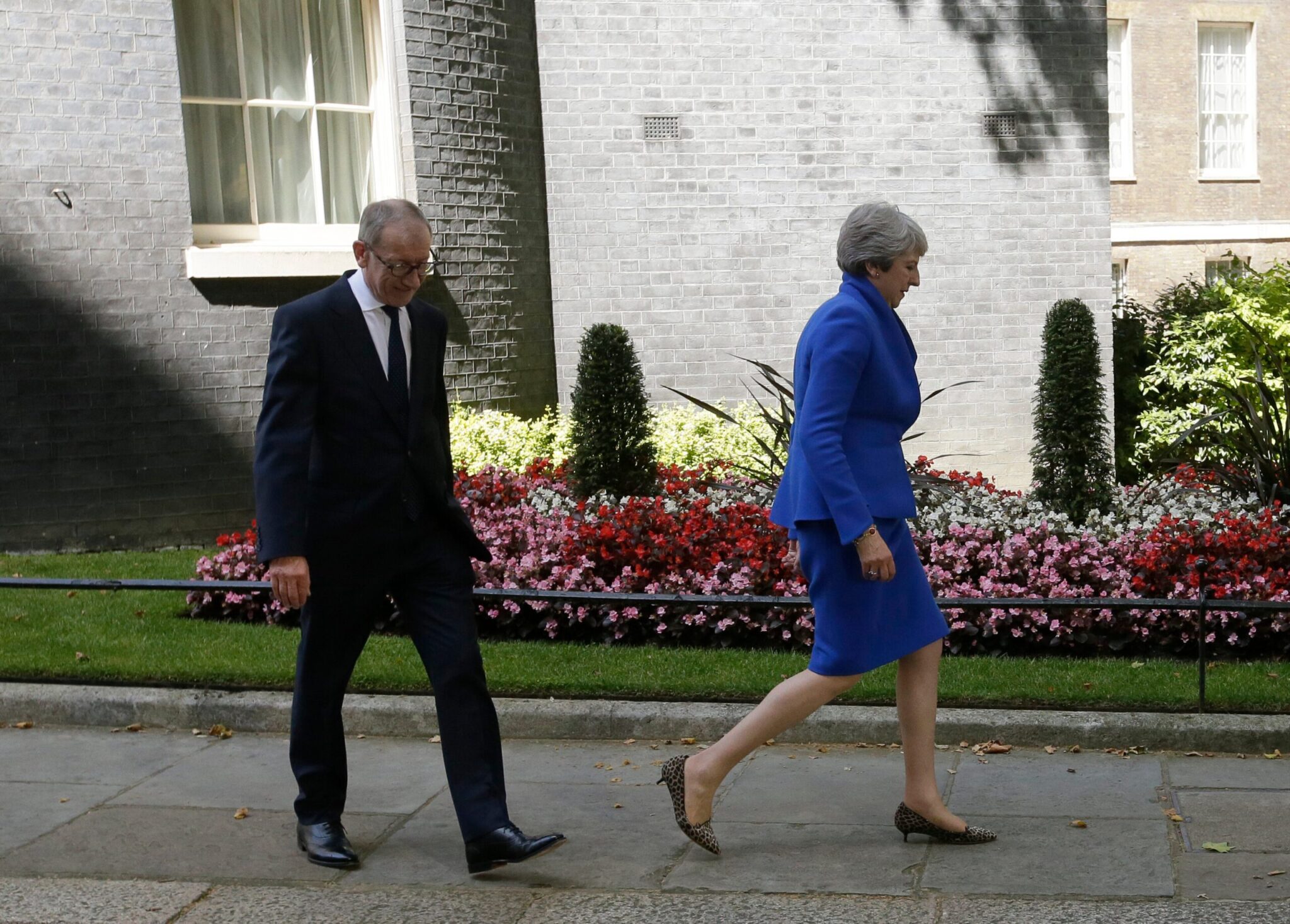 Η πρώην πρωθυπουργός, Τερέζα Μέι, αποχωρεί από την Ντάουνινγκ Στριτ μαζί με τον σύζυγό της.  ASSOCIATED PRESS